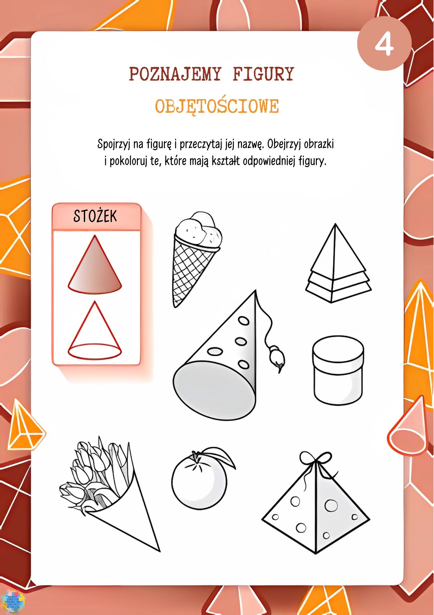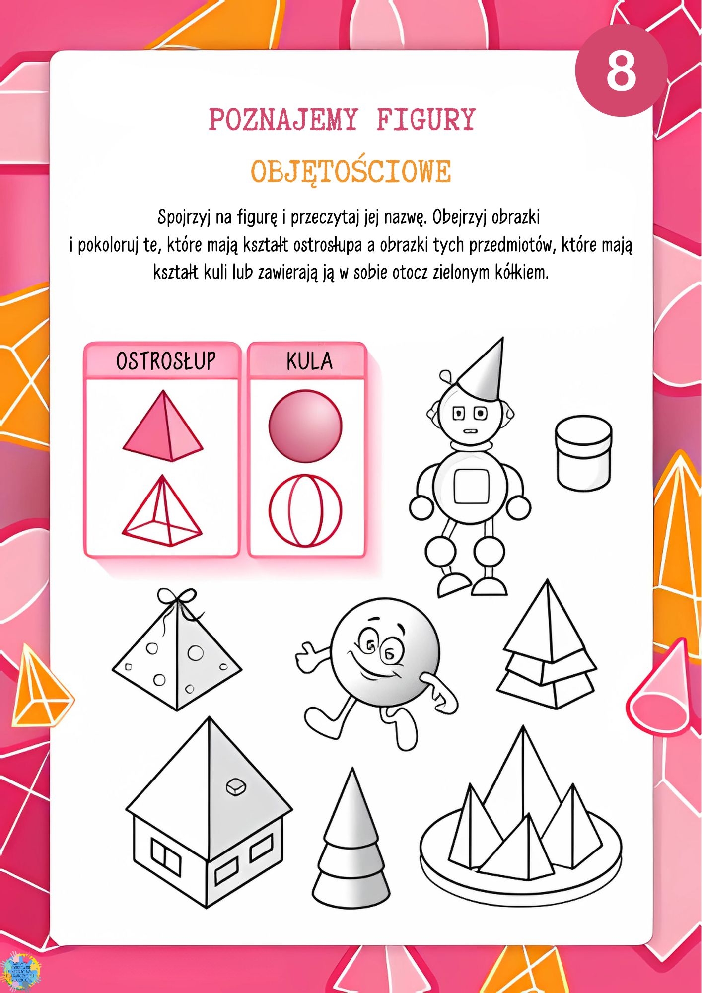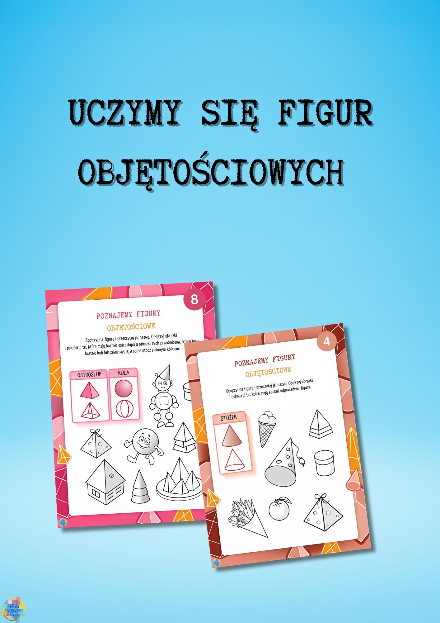 Zestaw składa się z 8 zadań, które mają pomóc dziecku w nauce różnych figur objętościowych, takich jak sześcian, kula, walec, stożek i piramida. Na każdym zadaniu z obrazkami, należy zaznaczyć kolorem lub zaznaczyć takie obiekty, które posiadają odpowiedni kształt (figurkę). Dzięki temu dziecko rozwija umiejętność porównywania, myślenia przestrzennego, motorykę małą oraz percepcję wzrokową. Rysunki postaci w zadaniach mają podpisy, dzięki czemu dziecko może łatwo nauczyć się czytać i zapamiętywać ich nazwy. Wykonanie zadań z zestawu pomaga rozwijać wyobraźnię oraz przygotowuje do doskonalenia umiejętności pisania i rysowania.