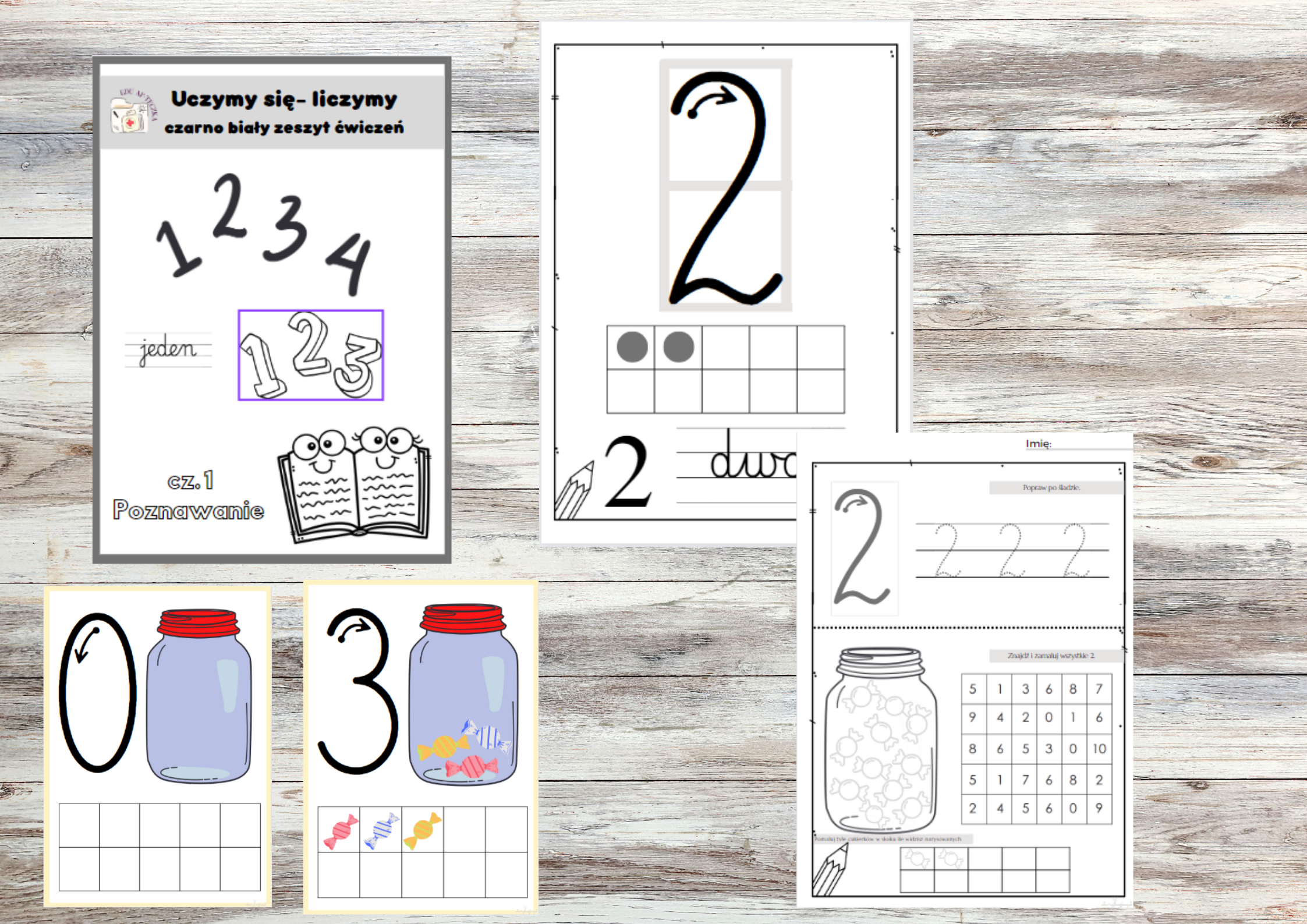 Zeszyt ćwiczeń z biało czarnymi kartami + kolorowe demonstracyjne. które mogą posłużyć na gazetkę w klasie. Materiał składa się z 32 stron.