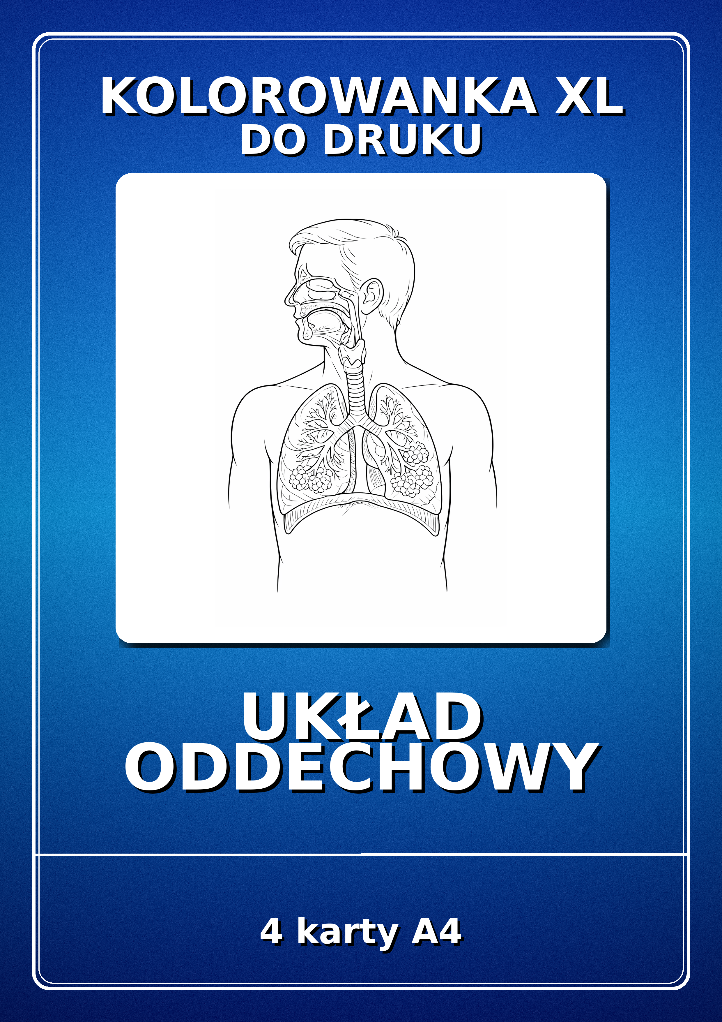 Materiał to kolorowanka, plakat XL UKŁAD ODDECHOWY do druku: duża ilustracja podzielona na 4 strony A4, które po złożeniu tworzą jeden plakat w formacie XL, oraz miniatura plakatu w formacie A4 do pracy indywidualnej. Łącznie 5 stron - pliki PDF.