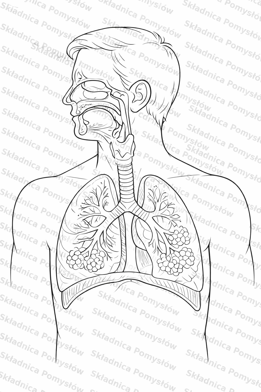 - Kolorowanie: ustal klucz (np. różne kolory dla dróg oddechowych, płuc, przepony) i pokoloruj elementy.