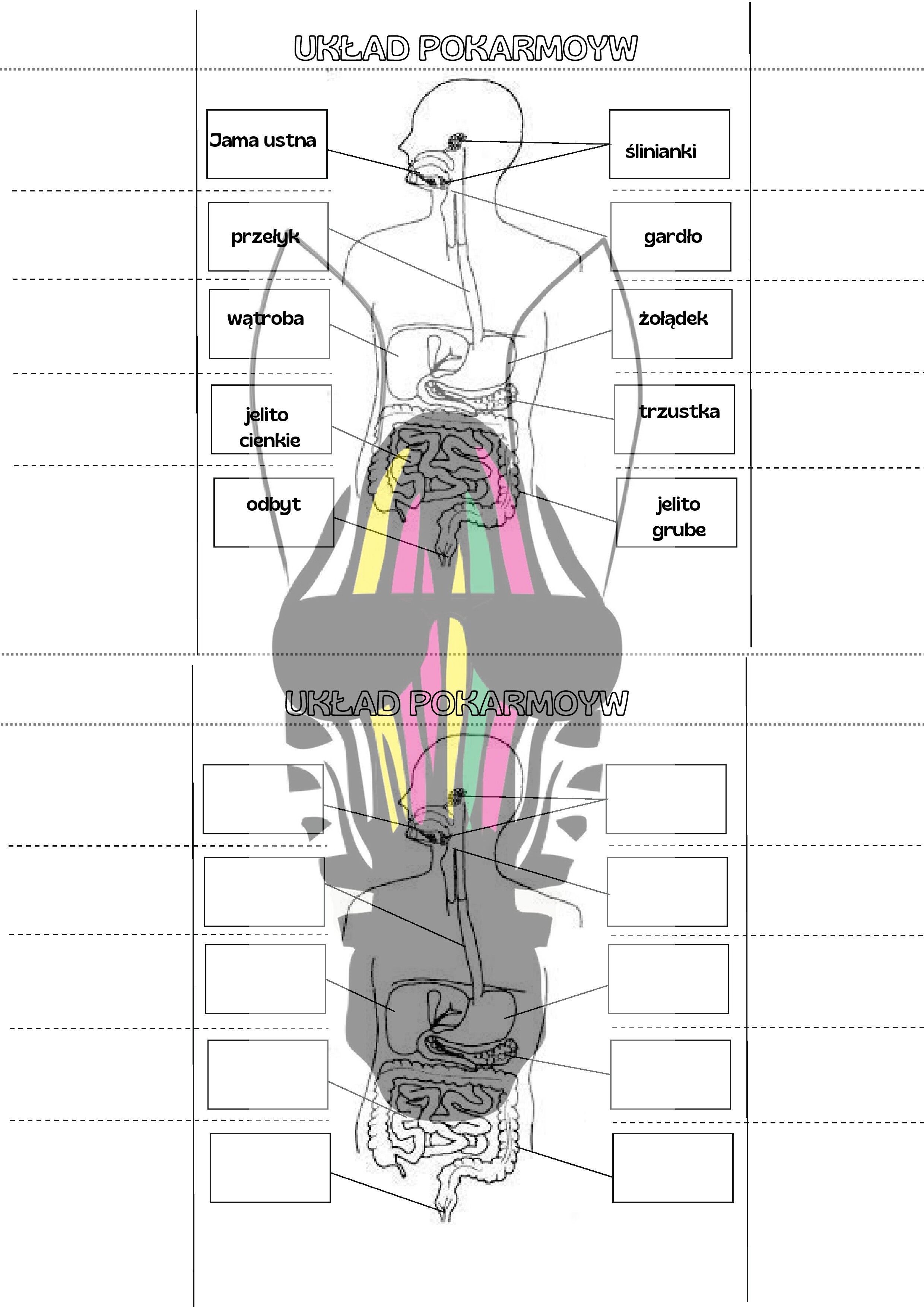 Notatka okienkowa z układem pokarmowym. Uczeń samodzielnie uzupełnia okienka a następnie się odpytuje. Karta pracy jest czarno biała. 1 strona