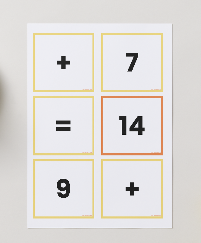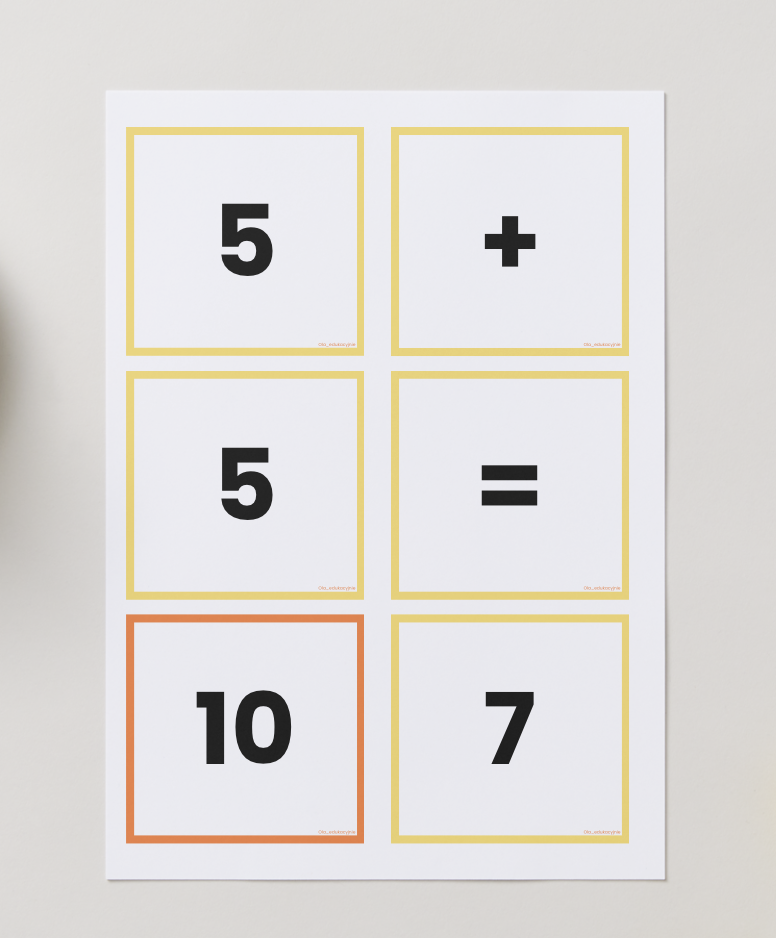 Zadaniem dzieci jest ułożenie poprawnych działań z dostępnych kwadratów zawierających liczby oraz znaki matematyczne. Wyniki są wyznaczone (wyróżnione w osobnych ramkach), dlatego uczeń musi odnaleźć właściwe połączenie liczb, aby działanie było poprawne.