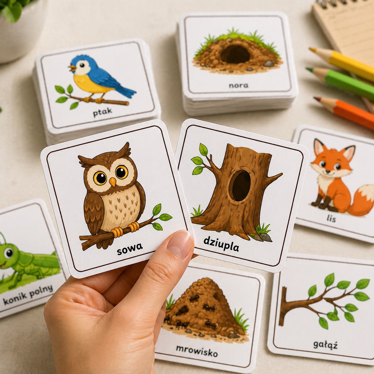 Dzieci łączą zwierzęta z odpowiednimi miejscami: sowa – dziupla, lis – nora, mrówki – mrowisko, ptak – gałąź, konik polny – trawa. To prosta, angażująca aktywność, która świetnie sprawdzi się podczas zajęć przyrodniczych, tematyki o zwierzętach, wiosny, lasu lub łąki 🌿