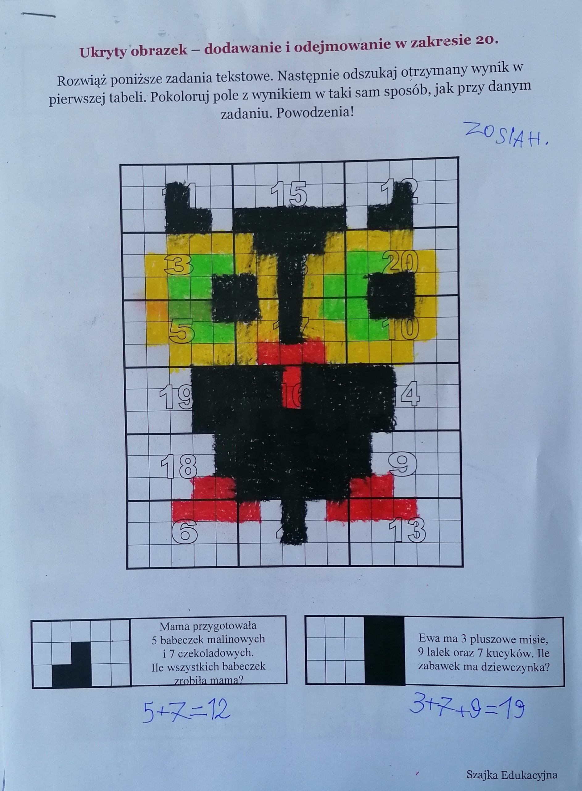 Ukryty obrazek - zadania tekstowe dla pierwszaków. Popularna karta pracy polegająca na rozwiązaniu podanych zadań, a następnie odkodowaniu ukrytego obrazka. Tym razem motywem przewodnim jest dodawanie i odejmowanie w zakresie 20. Powodzenia!