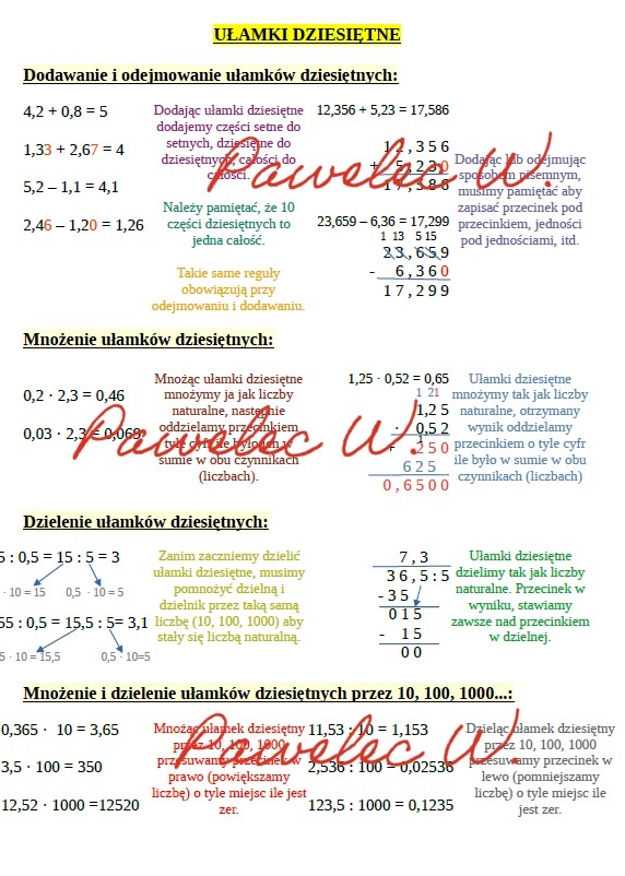 Plakat idealny do wyjaśnienia jak wykonać dodawanie, odejmowanie, mnożenie i dzielenie ułamków dziesiętnych.