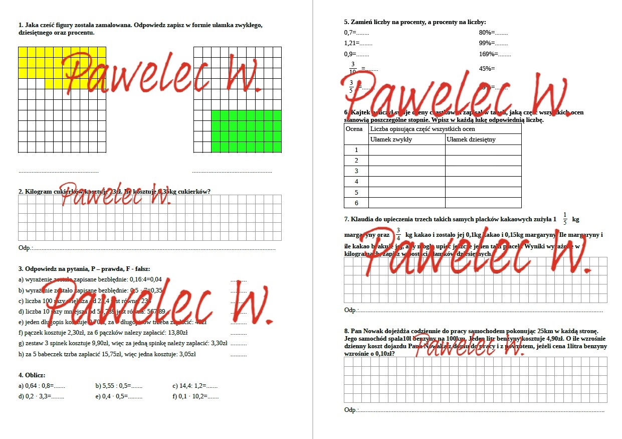 Karta pracy, która sprawdza wiedzę na temat ułamków dziesiętnych i zwykłych oraz procentów.