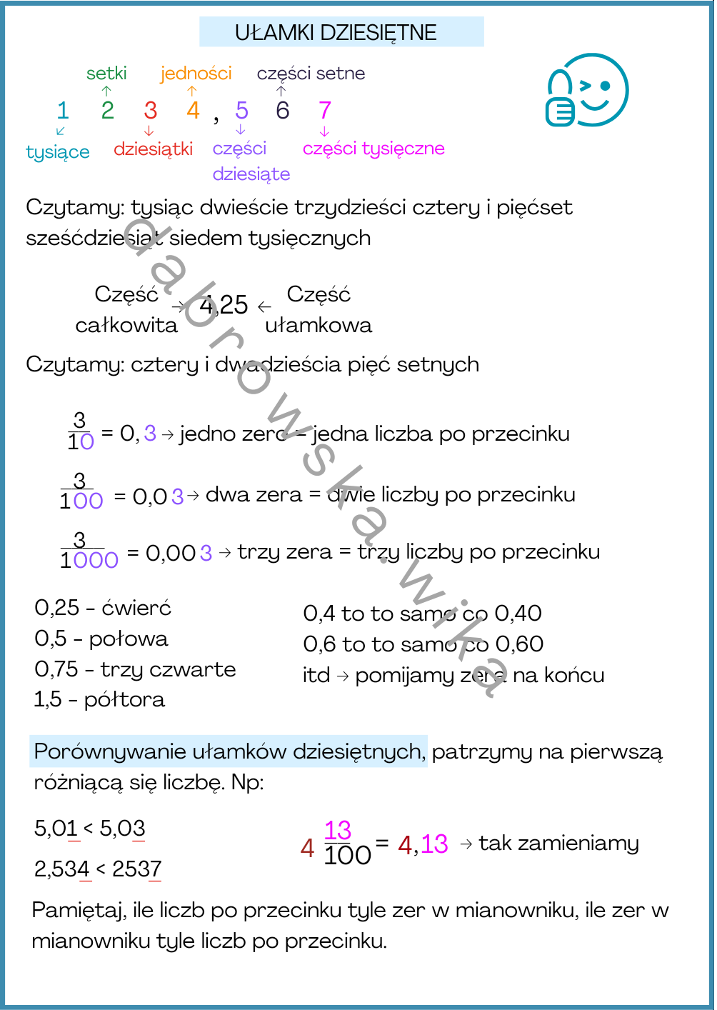 Notatka zawiera podstawowe informacje na temat ułamków dziesiętnych takich jak: