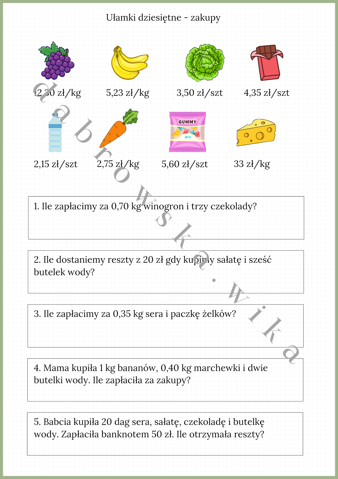 Taka forma pracy pozwoli poćwiczyć praktyczne zastosowanie działań na ułamkach dziesiętnych i zachęci ucznia do pracy.