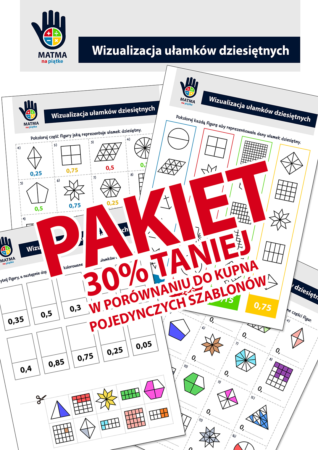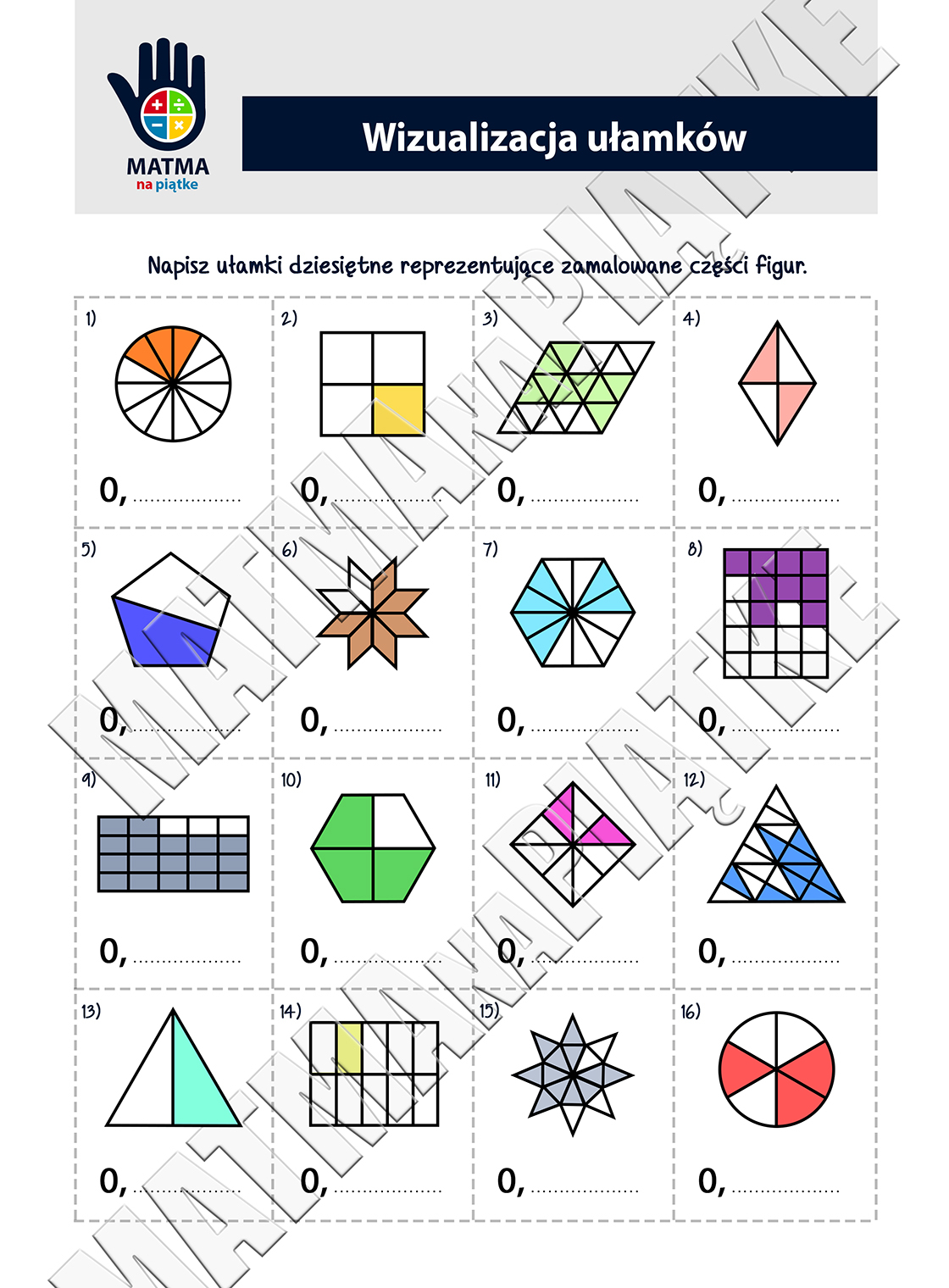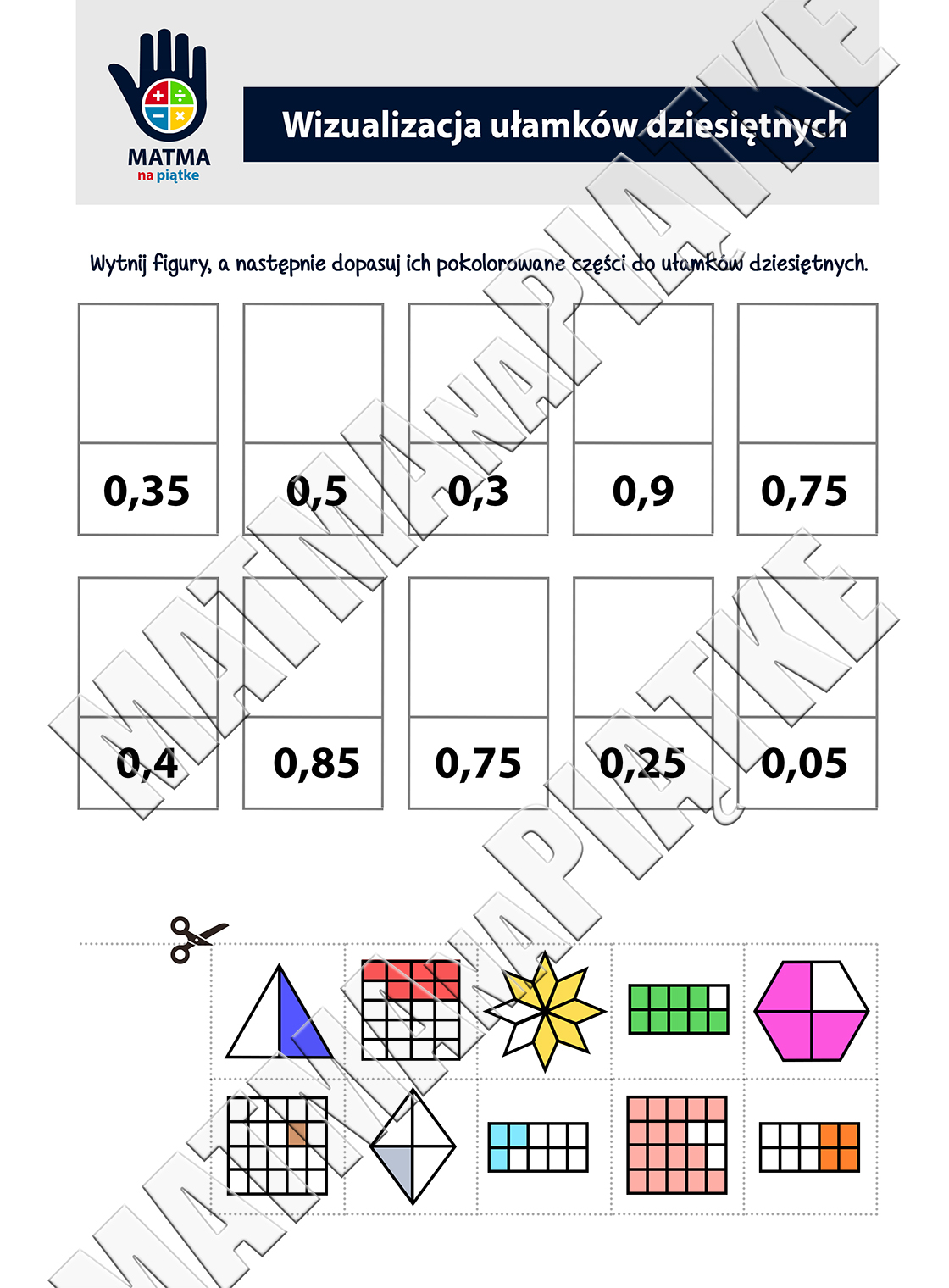 Ułamki dziesiętne - Zestaw. Karta pracy dla uczniów klas czwartych i piątych - ułamek jako część całości.