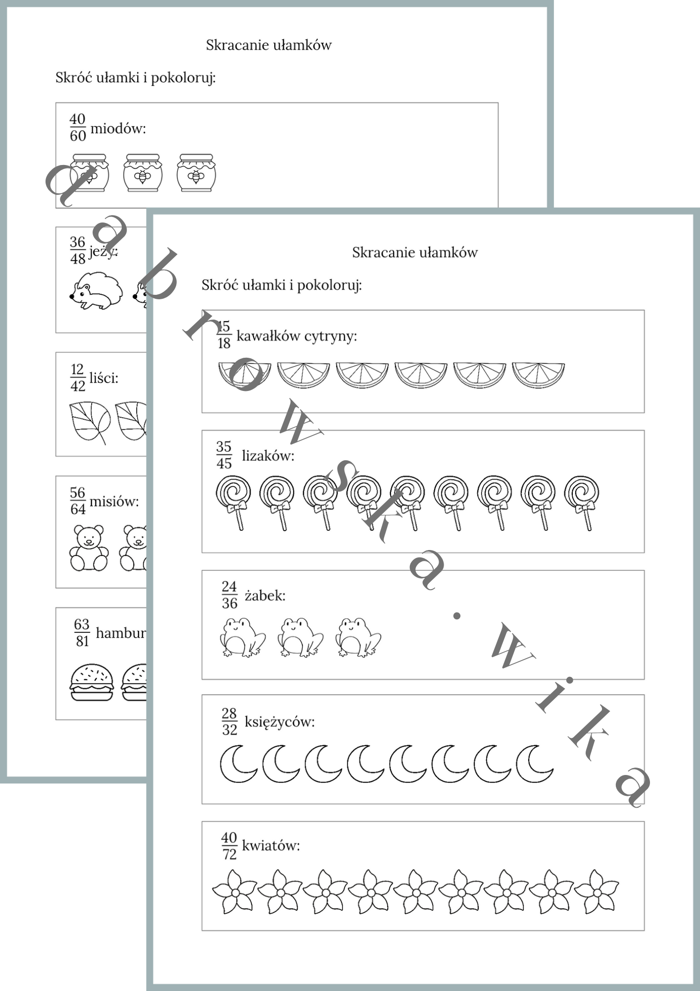 Uczniowie mają za zadanie skrócić ułamki do najprostszej postaci, a następnie pokolorować odpowiednią liczbę elementów.
