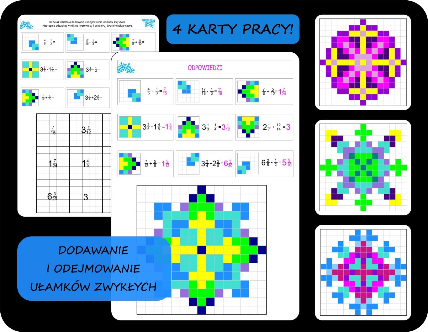 Kodowanki typu bloksy to atrakcyjne zadania, w których uczeń ćwiczy dodawanie i odejmowanie ułamków zwykłych, a następnie koloruje odpowiednie kratki zgodnie z podanym kodem kolorystycznym. Poprawne wykonanie obliczeń prowadzi do odkrycia ukrytego obrazka - kolorowej śnieżynki/ zimowej mandali. Materiał łączy naukę z zabawą, rozwija koncentrację, dokładność i umiejętności rachunkowe w przyjemny, wizualny sposób.