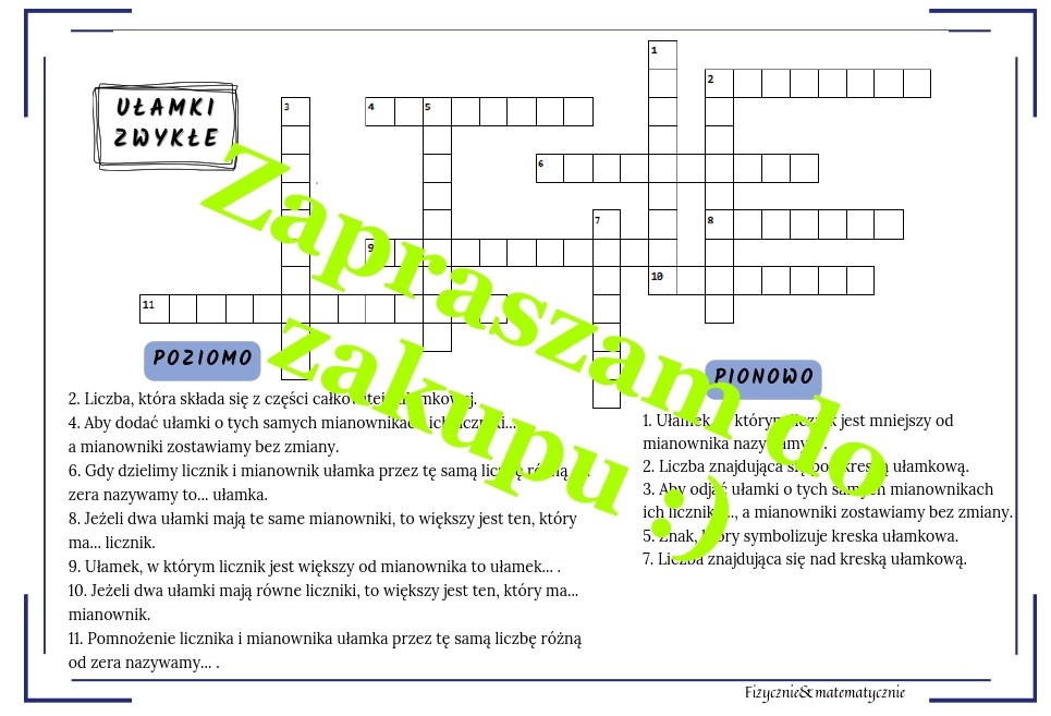 Krzyżówkę wykorzystuję w klasie 4, jako jedno z zadań powtórzeniowych podczas lekcji utrwalającej poznane wiadomości o ułamkach zwykłych.