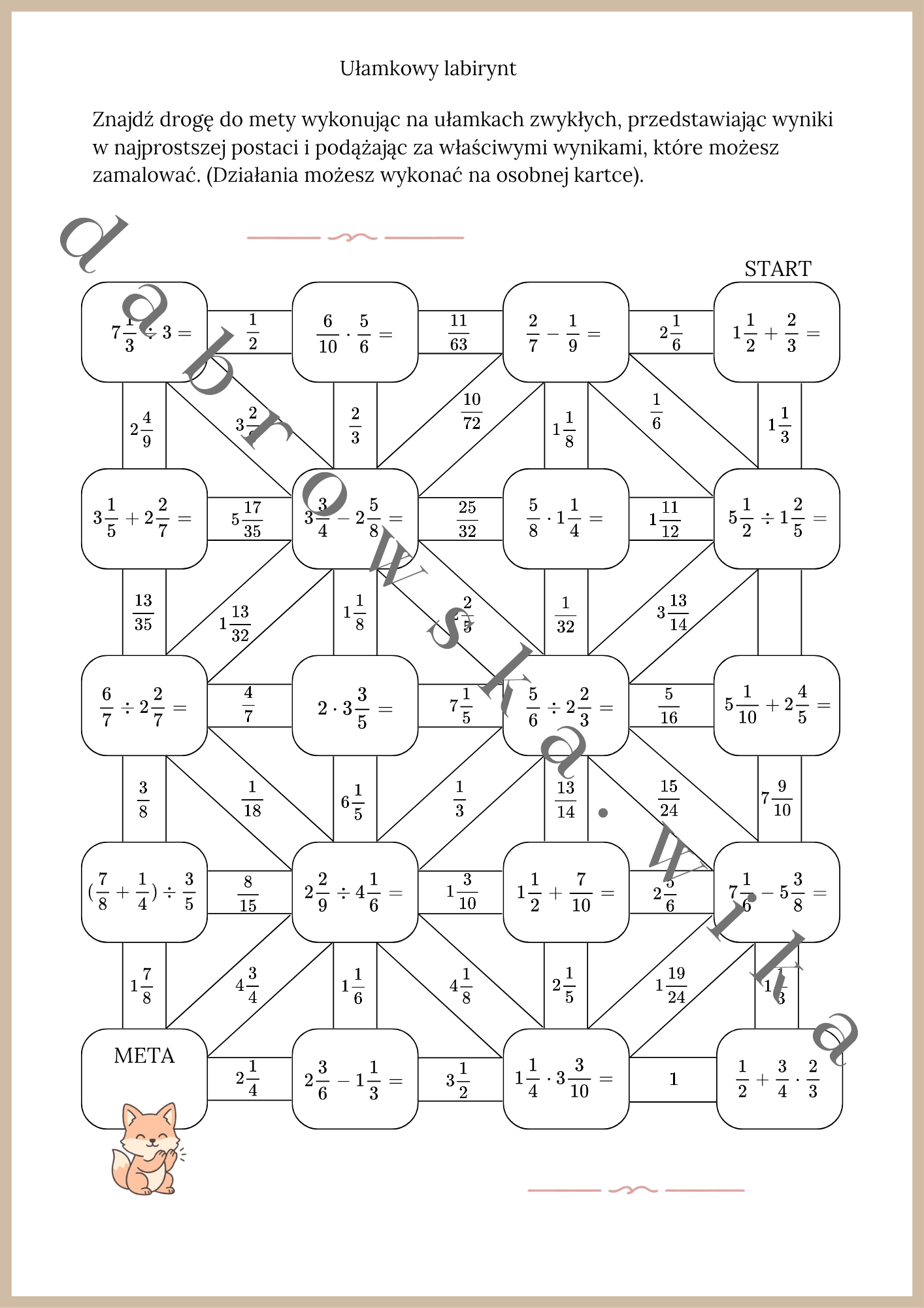 Materiał zawiera kartę pracy w formie labiryntu, w której uczniowie wykonują działania na ułamkach zwykłych.
