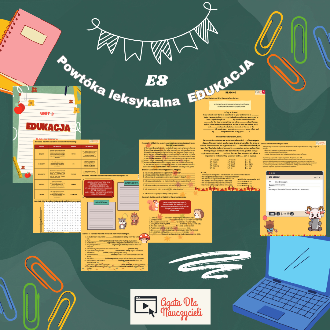 Materiał składa się z 9 zadań leksykalnych utrwalających słownictwo do E8 z działu Edukacja.