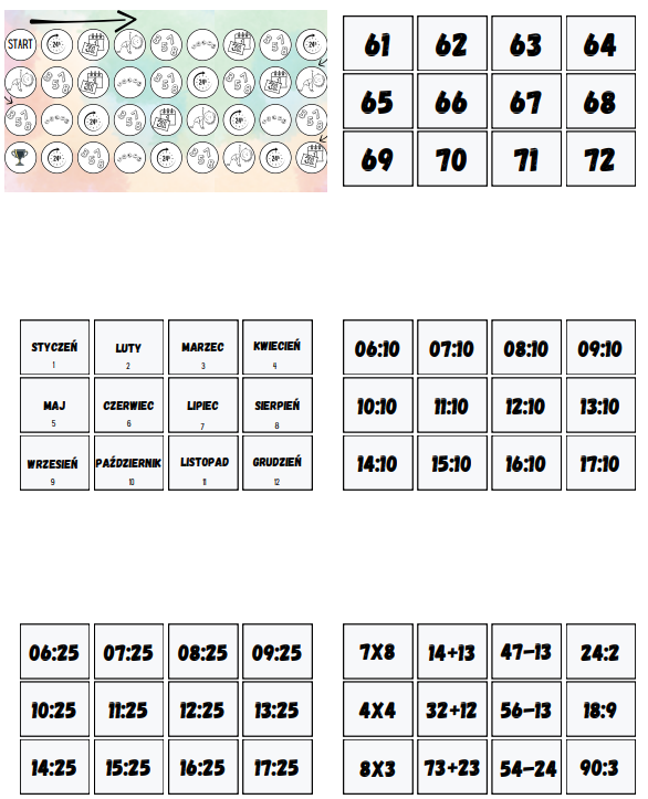 Gra planszowa może być wykorzystana do nauki oraz utrwalenia zasad użycia liczebników w językach obcych lub na lekcjach powtórkowych z matematyki, a także na zajęciach świetlicowych. Plansza do gry plus karty z każdej kategorii.