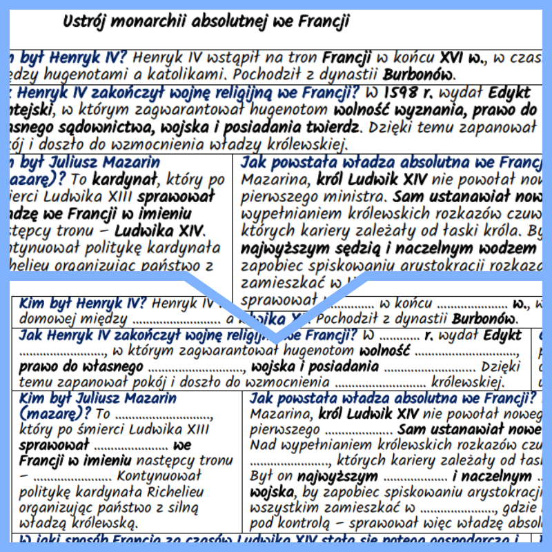 Notatki w formie pytań i odpowiedzi do grupy zagadnień pt. Ustrój monarchii absolutnej we Francji; 2. Ustrój monarchii parlamentarnej w Anglii; 3. Nowe imperia europejskie: Prusy, Austria i Rosja; 4. Stany Zjednoczone Ameryki – początki państwowości; 5. Europa w dobie oświecenia;, przygotowane dla klasy 6 według podstawy programowej nauczania historii w szkole podstawowej (Podstawa programowa – Historia – Szkoła podstawowa IV-VIII) oraz karta pracy zawierająca luki w treści wymagające uzupełnienia ustnego lub pisemnego. Wyciąg z notatek maturalnych do egzaminu pisemnego i ustnego z historii.