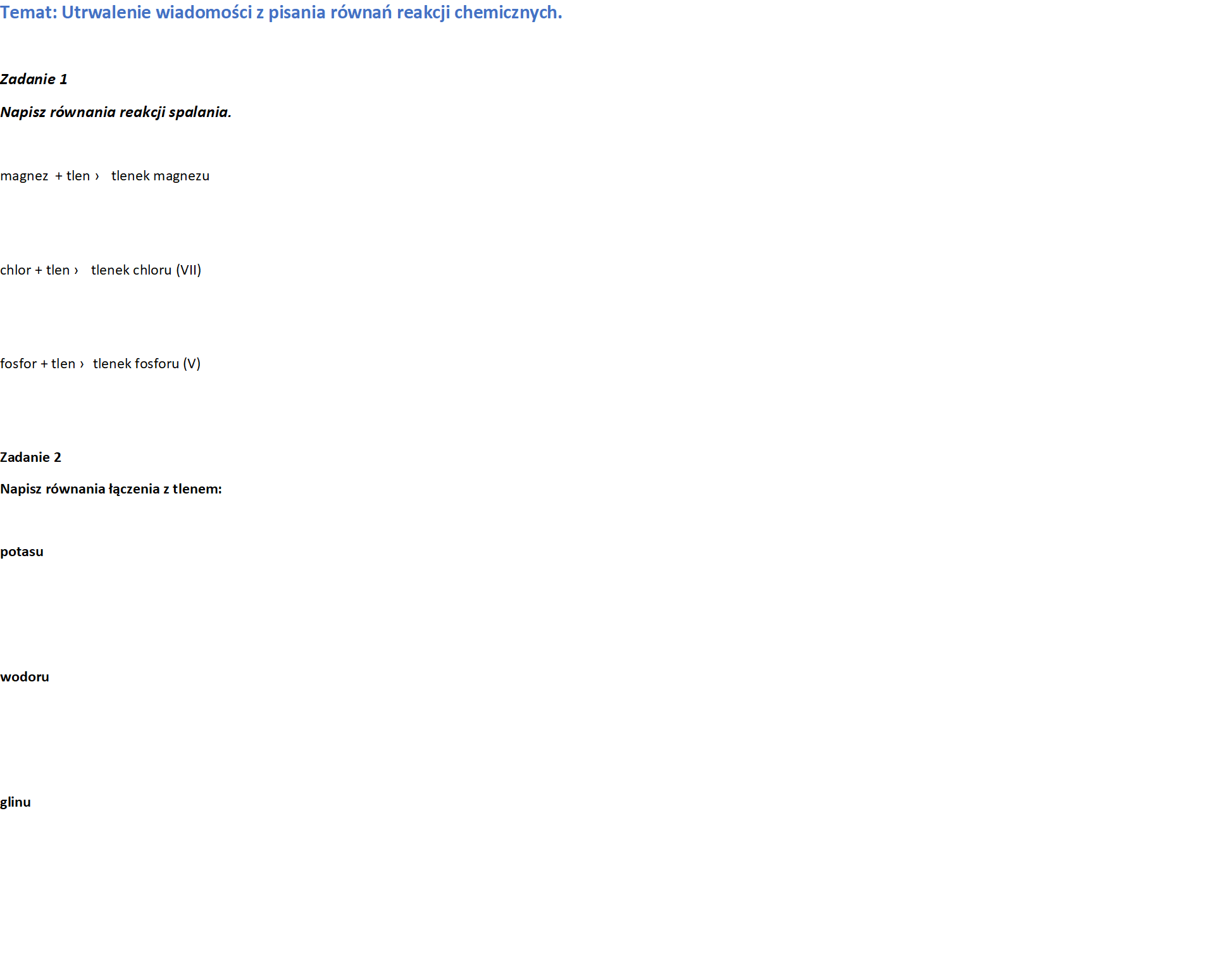Karta pracy na powtórzenie wiadomości z pisania równań reakcji chemicznych.