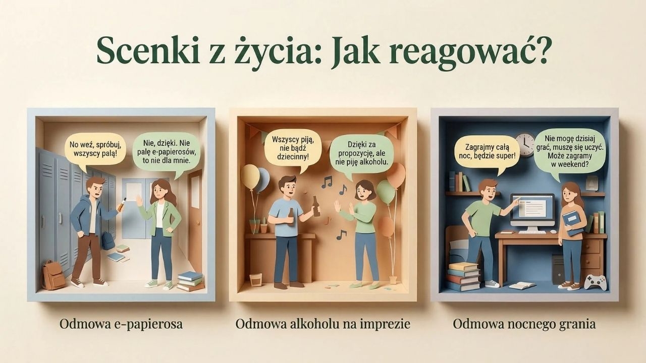 Z materiałem można pracować jako gazetką szkolną, umieszczając plansze na korytarzu, w sali, bibliotece lub przy gabinecie pedagoga, ale bardzo dobrze sprawdzi się też jako prezentacja na zajęciach. Najlepiej omawiać go modułowo: najpierw czym są uzależnienia i jak działają na mózg, potem konkretne zagrożenia (alkohol, e-papierosy, hazard, świat online), a na końcu asertywność, odmawianie, równowaga cyfrowa i miejsca wsparcia. Dobrym zakończeniem zajęć może być stworzenie z klasą listy „bezpiecznych wyborów” albo przećwiczenie scenek odmowy w parach.