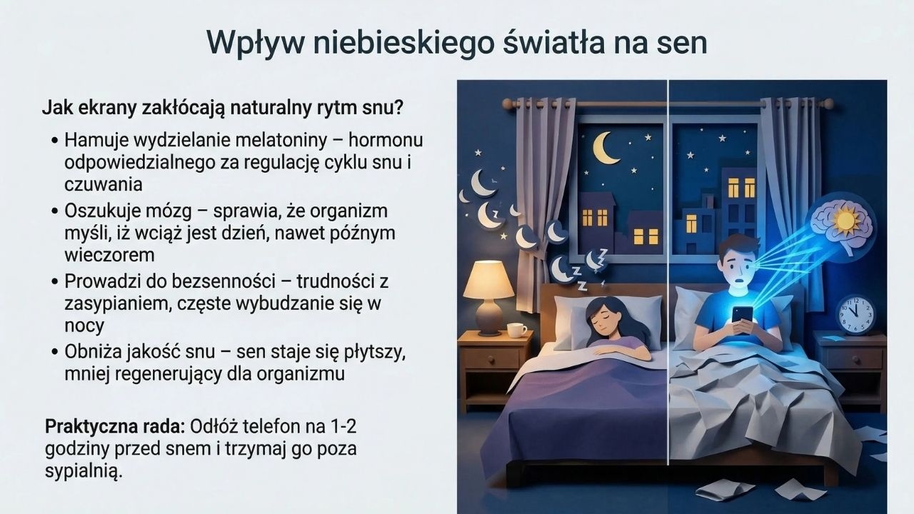 Materiał zwraca również uwagę na wpływ ekranów na sen, pokazując, jak niebieskie światło zakłóca wydzielanie melatoniny i pogarsza jakość odpoczynku (slajd 9). Następnie omawia problemy zdrowotne związane z nadmiernym korzystaniem ze smartfona, takie jak tzw. „smartfonowa szyja”, zmęczenie wzroku czy bóle głowy (slajd 10).
