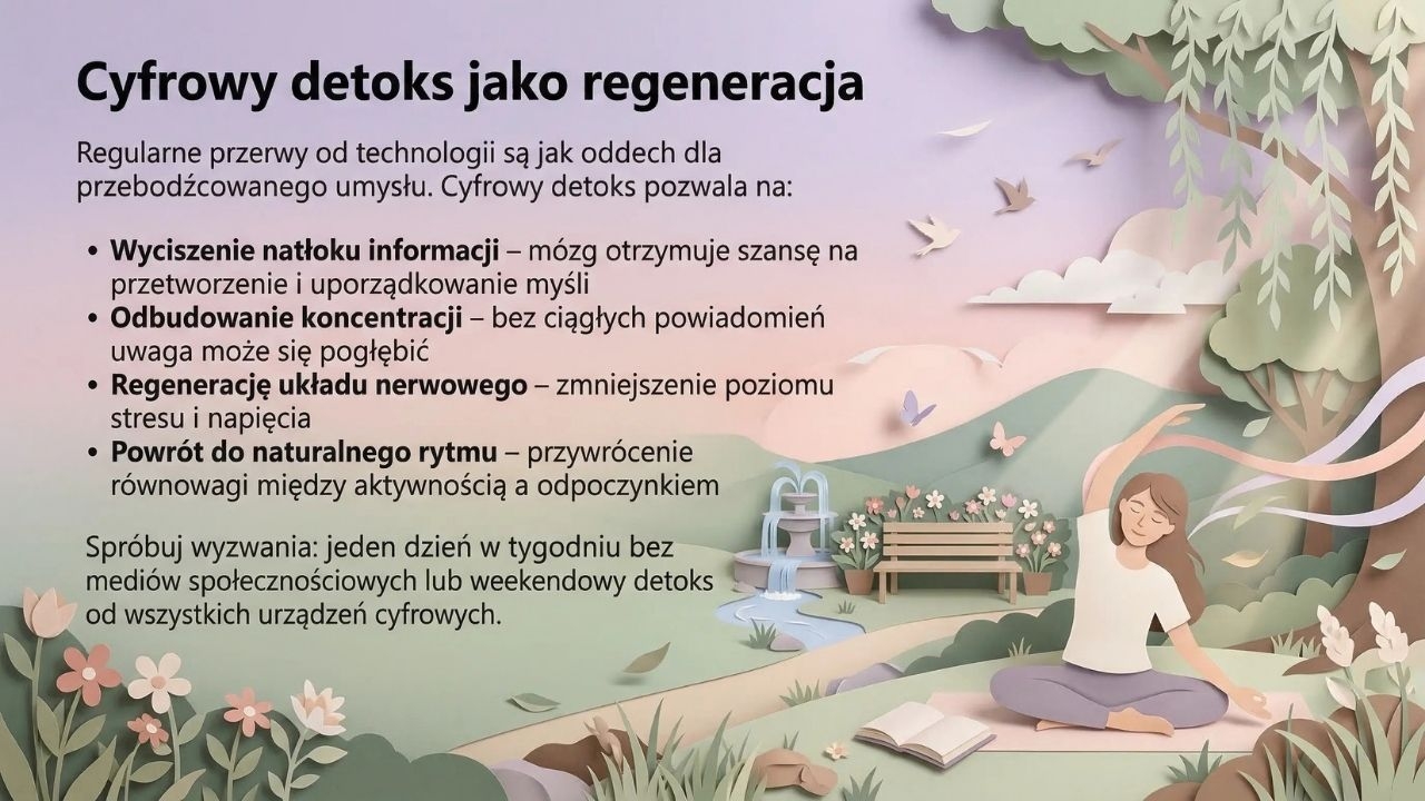 Kolejna plansza wprowadza pojęcie cyfrowego detoksu, czyli regularnych przerw od technologii, które pomagają odzyskać koncentrację i równowagę psychiczną (slajd 15). Następnie materiał zachęca do odkrywania aktywności w świecie offline – sportu, spacerów, spotkań z ludźmi i kontaktu z naturą (slajd 16).