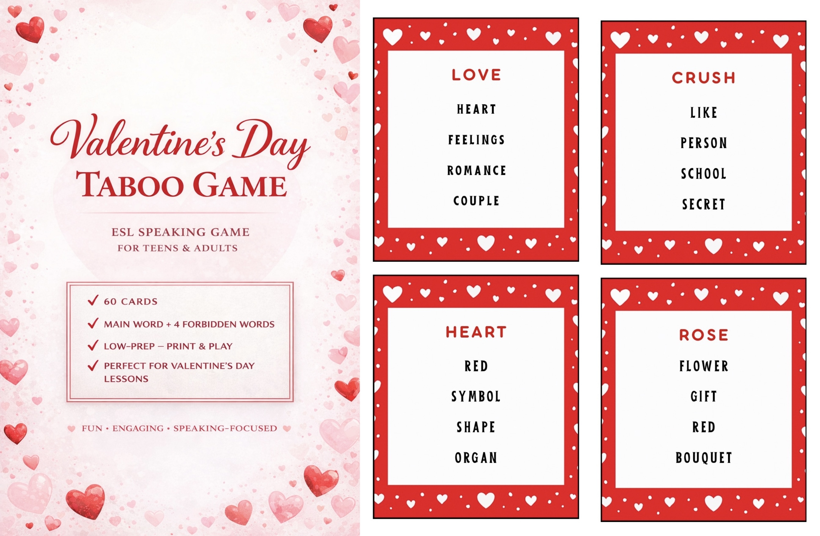 Valentine’s Day Taboo to dynamiczna gra komunikacyjna dla uczniów ESL na poziomie A2–B2.