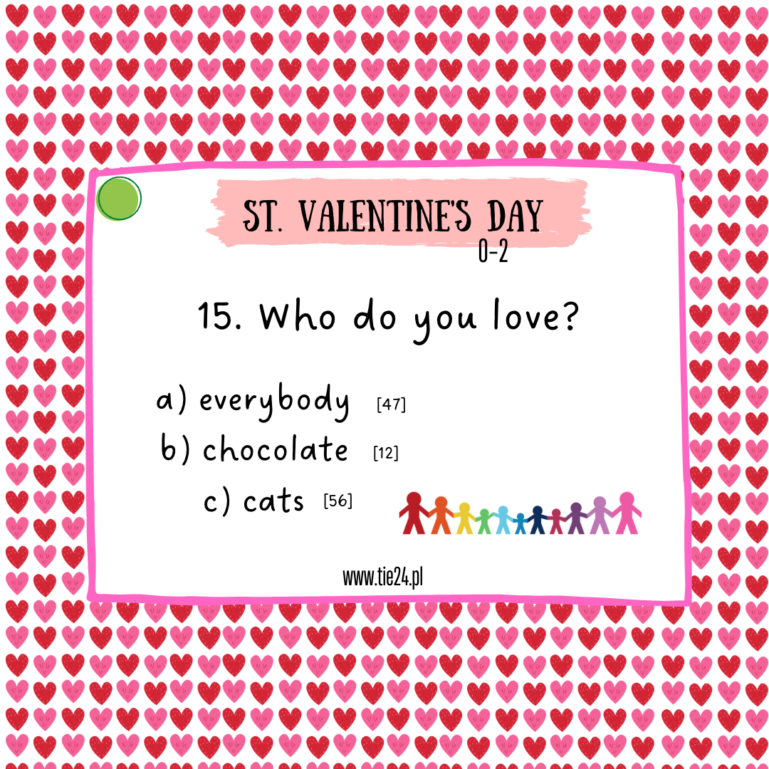 Pytania są związane z gramatyka, Walentynkami oraz Useful English.