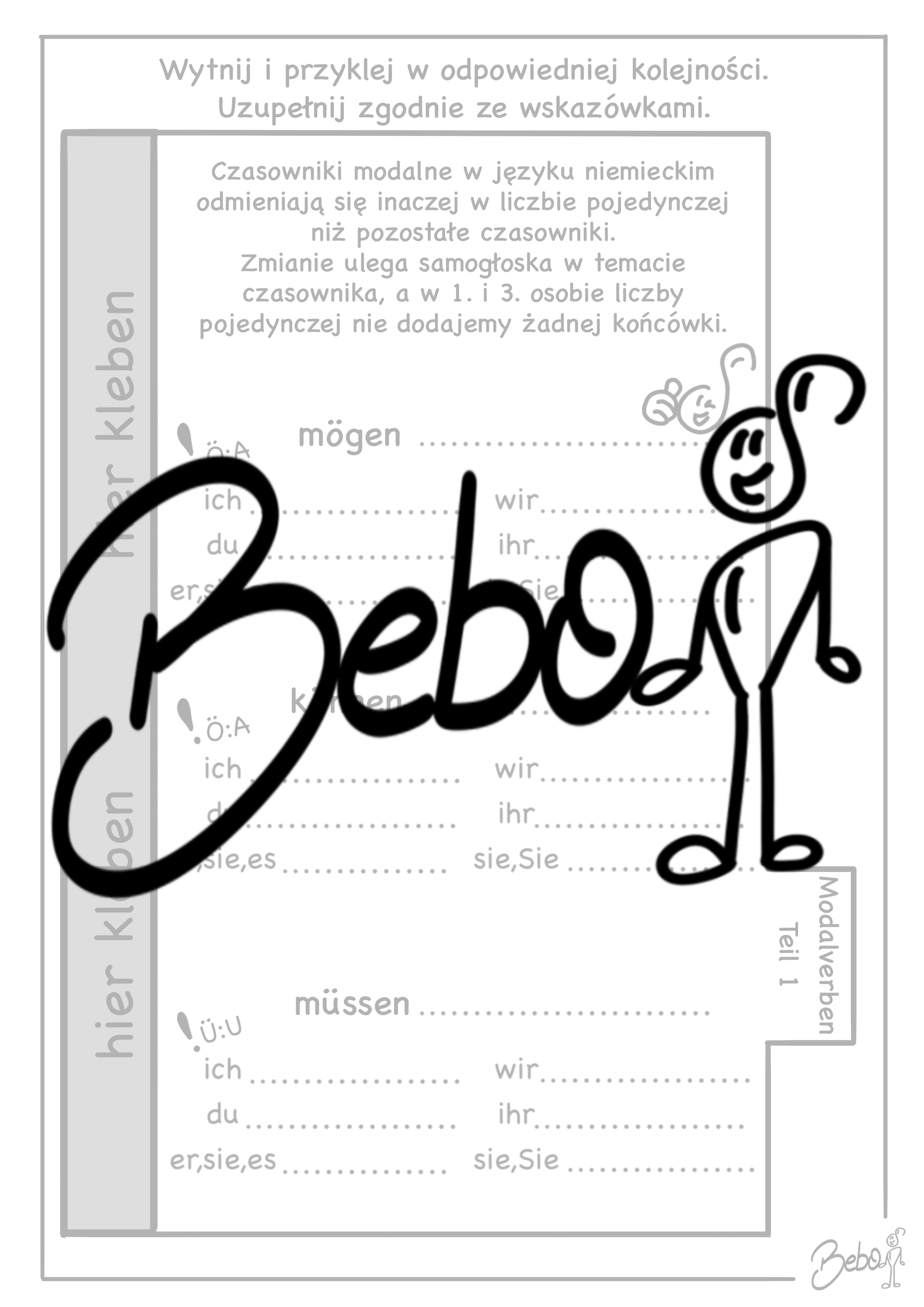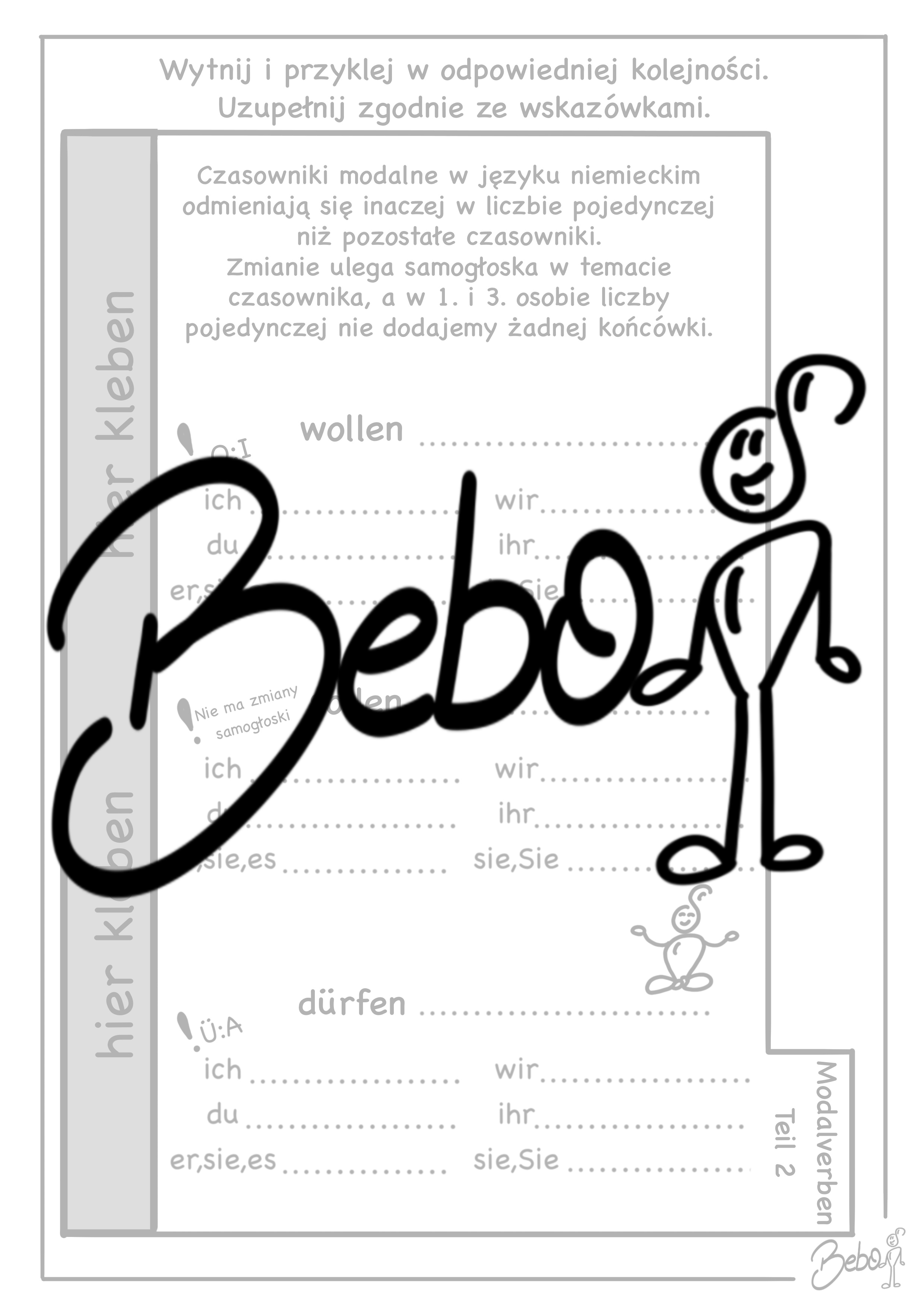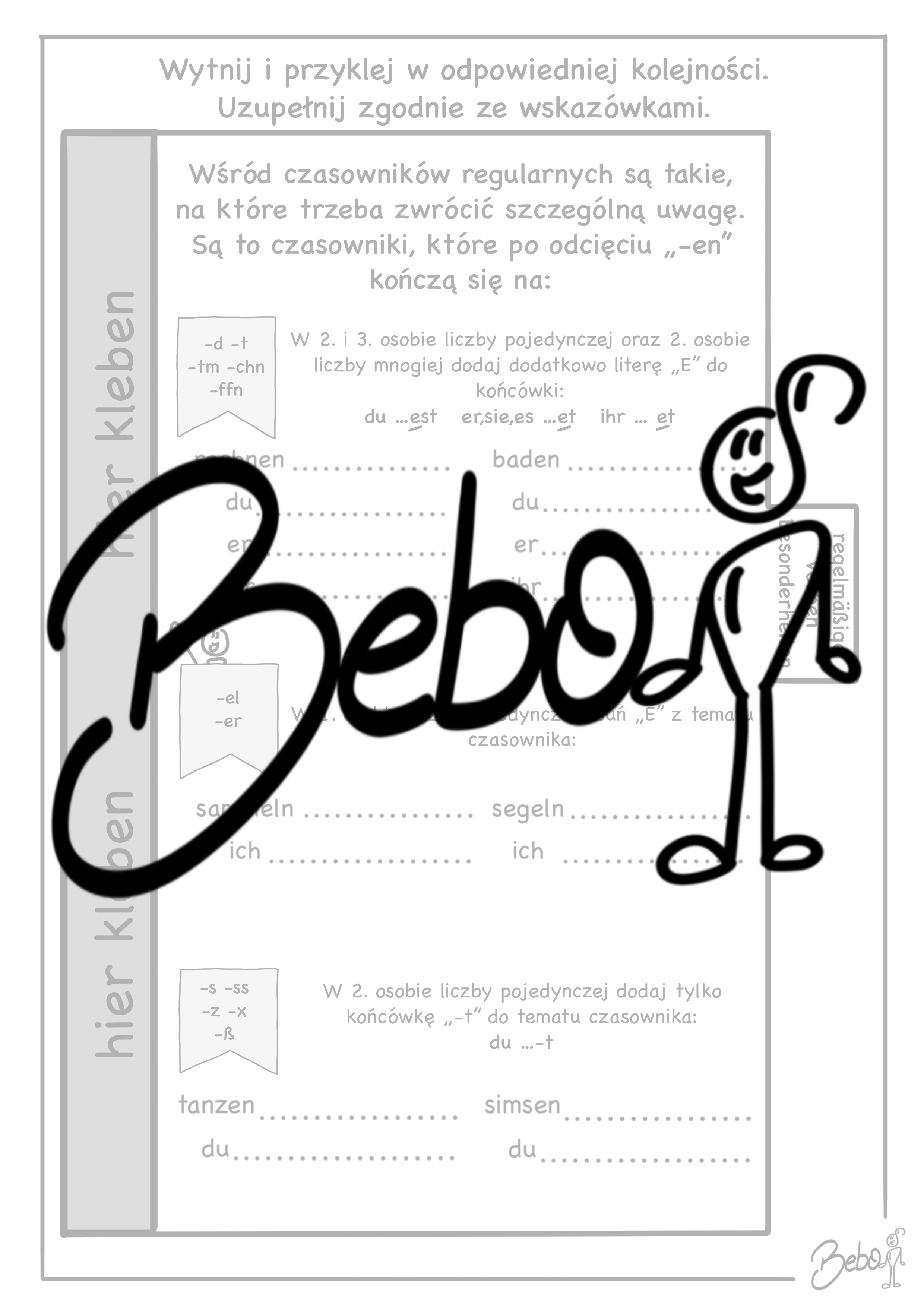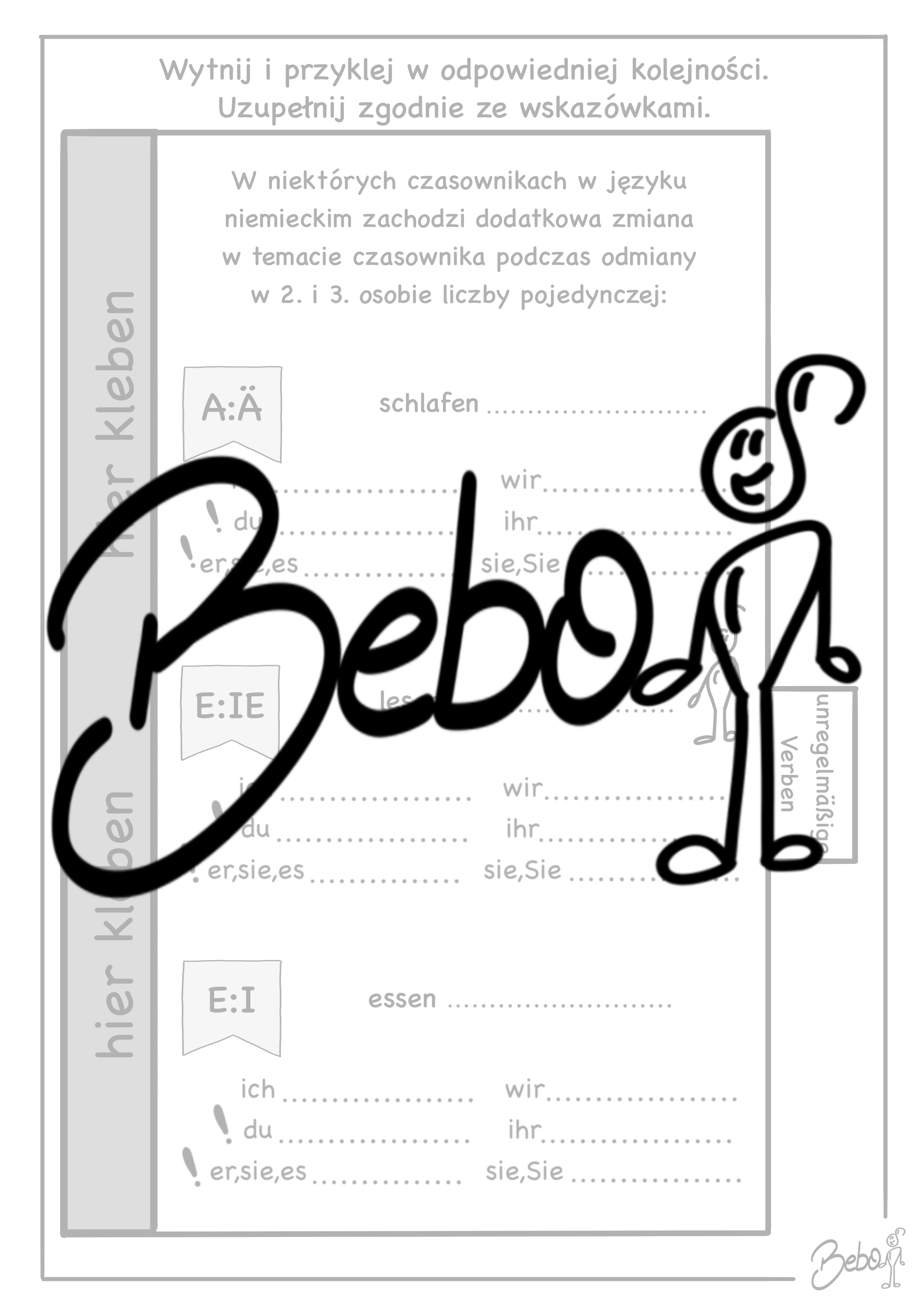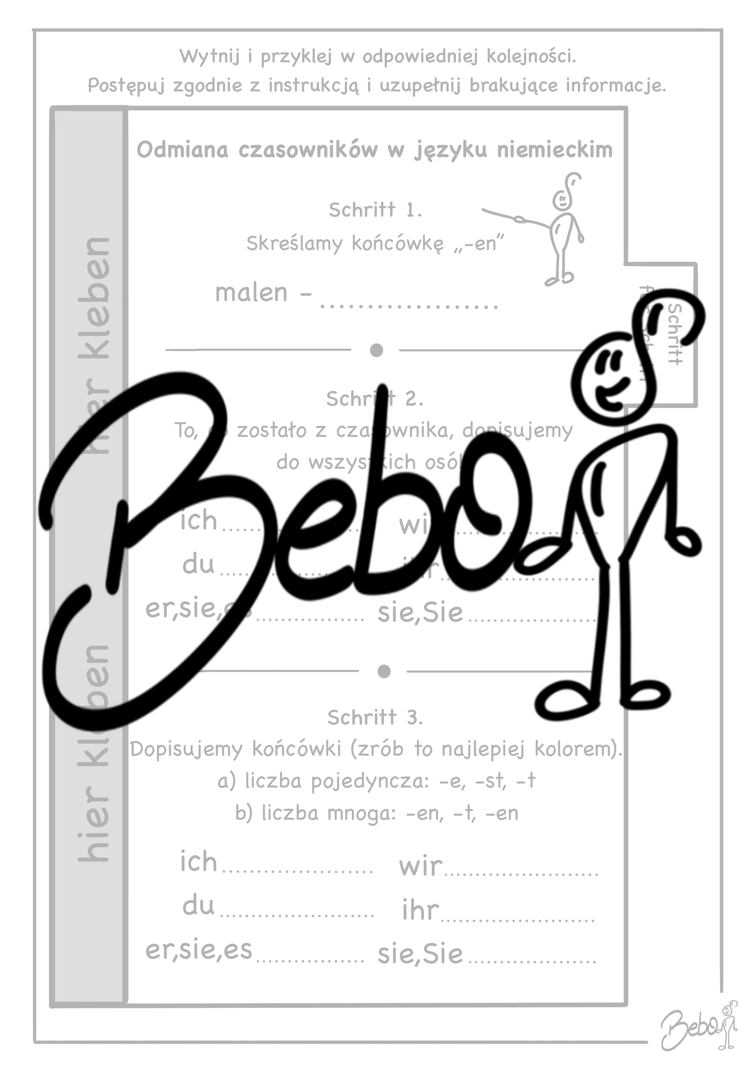 Materiał jest podsumowaniem informacji dotyczących odmiany czasowników w języku niemieckim. Każda zakładka porusza inne zagadnienie gramatyczne. Zadaniem jest uzupełnić brakujące informacji według podanych wskazówek. Docelowy format książeczki to format A5, żeby można było całość wkleić do zeszytu, lub wpiąć do skoroszytu.