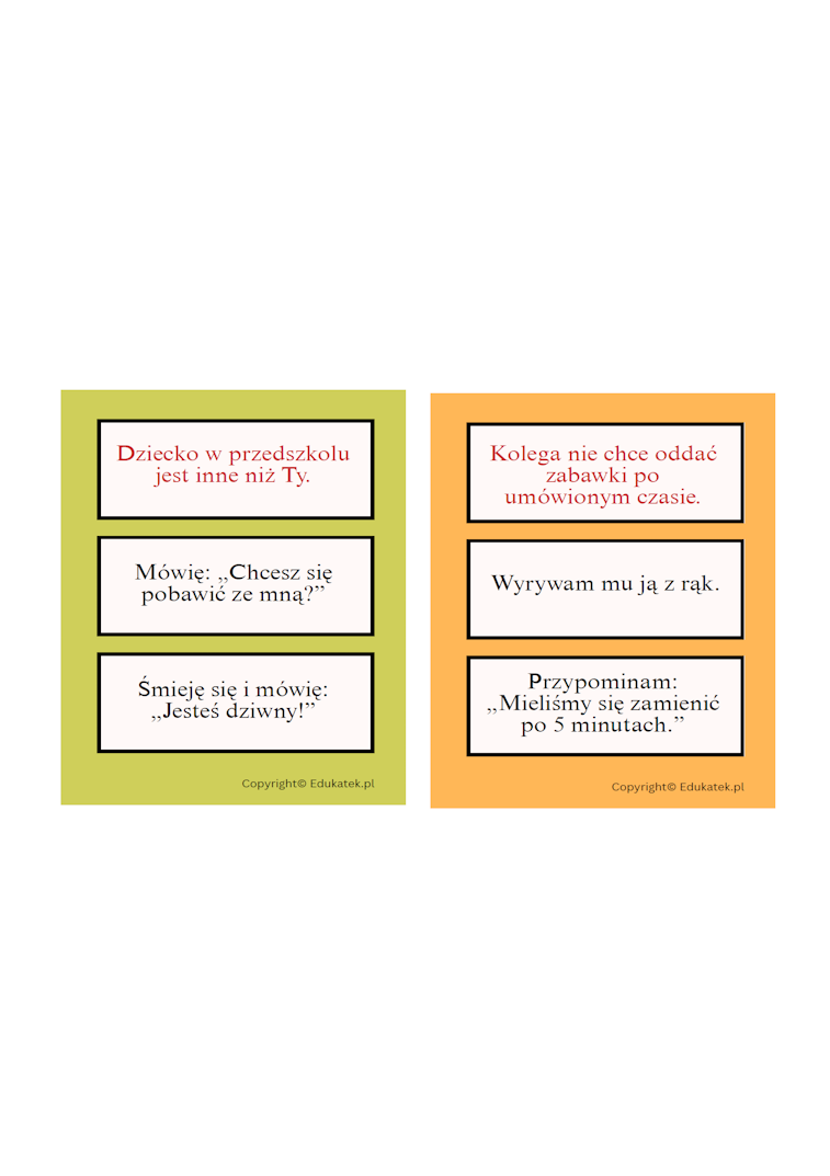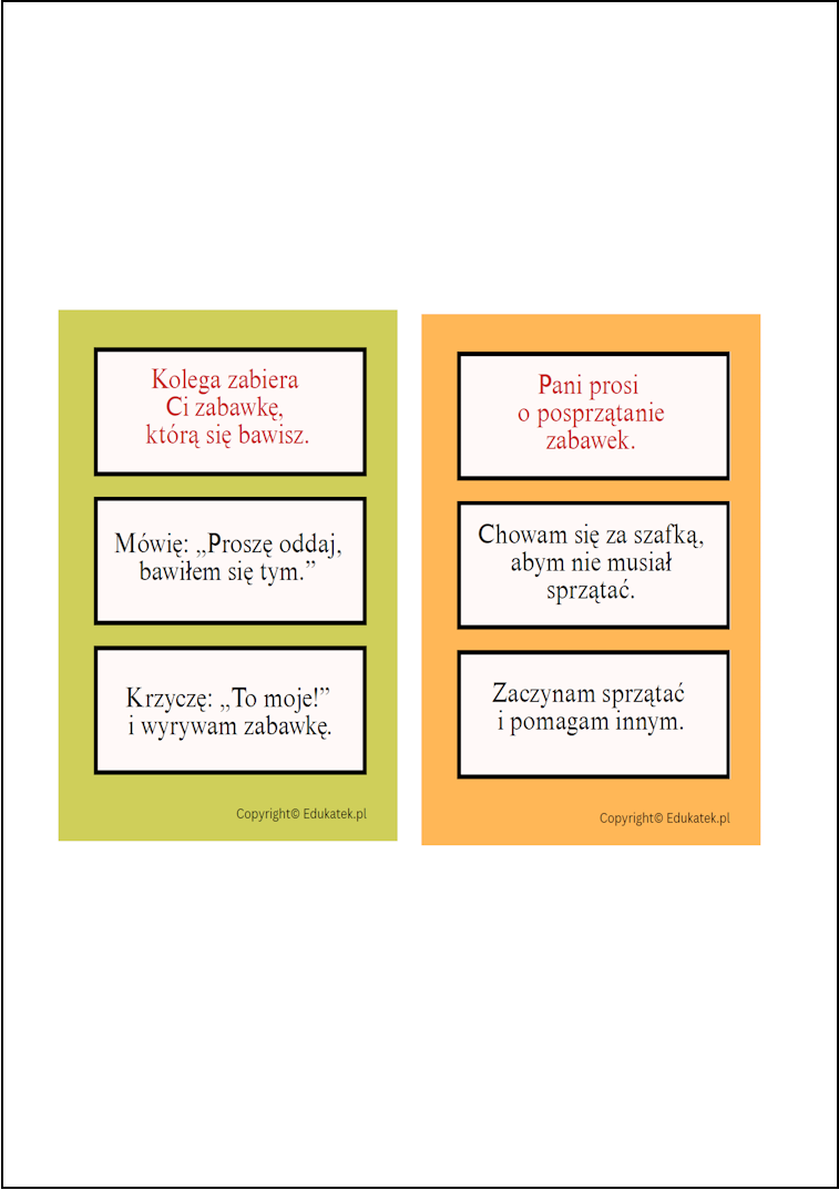 Zestaw zawiera 29 stron do samodzielnego wydruku. W skład zestawu wchodzą 50 kart – każda z nich zawiera krótką sytuację oraz dwie reakcje: właściwą i niewłaściwą oraz symboliczne emotki (uśmiechnięta i smutna).