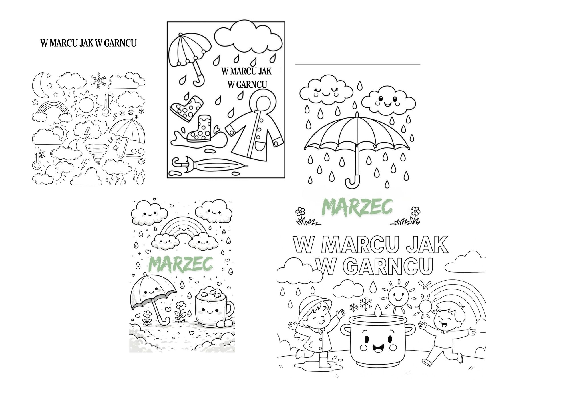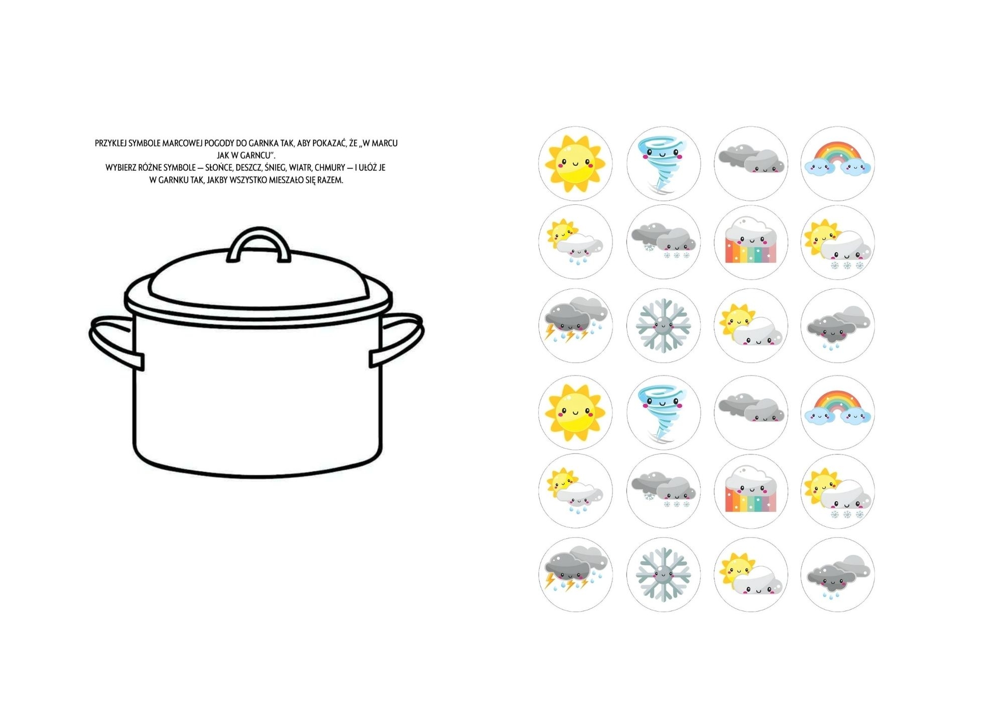 Słońce, deszcz, śnieg, wiatr i tęcza — maluchy mogą pokolorować wszystkie „składniki” marcowego garnka.