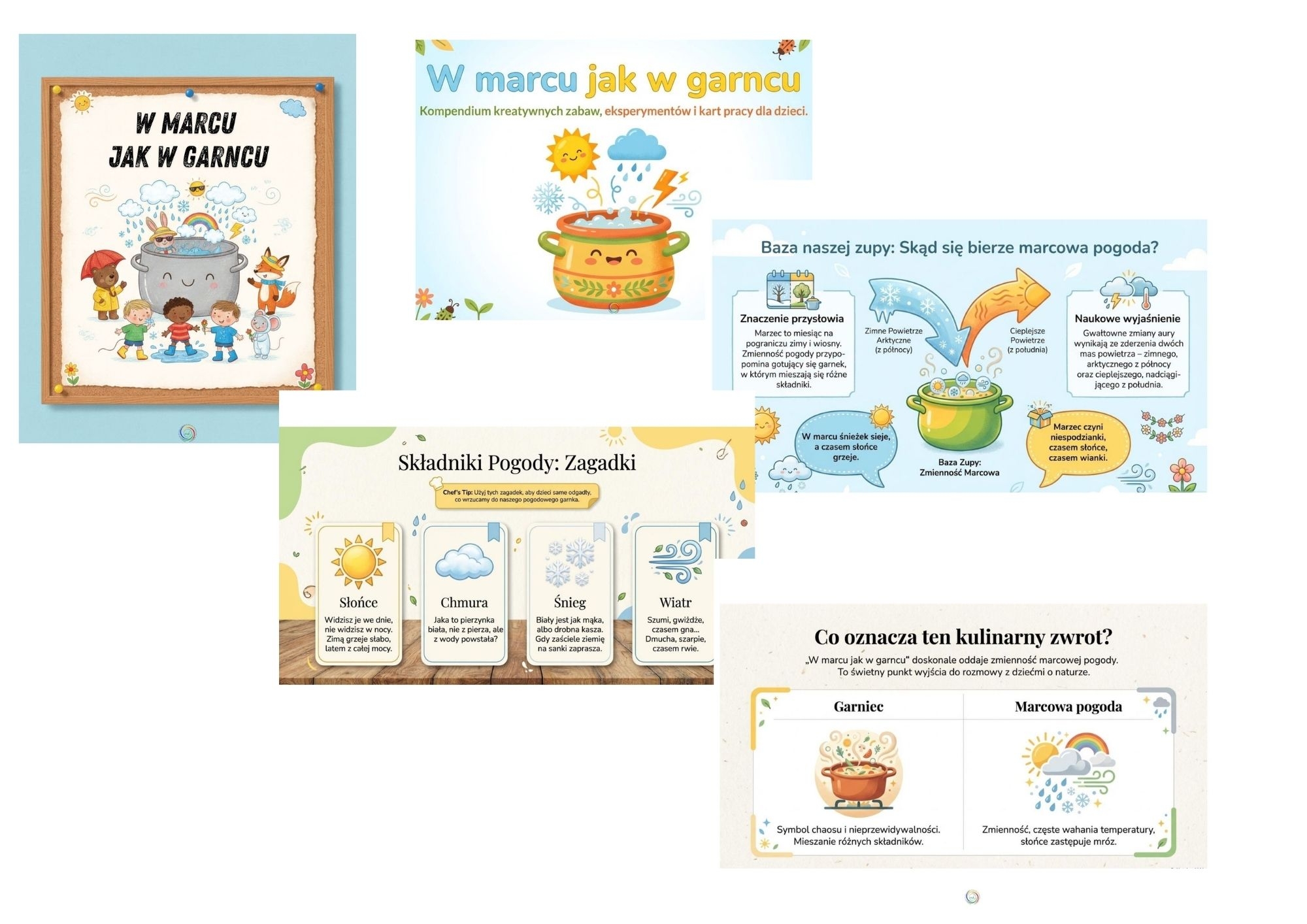 Proste wyjaśnienia, duże ilustracje i wesołe przykłady zmiennej marcowej pogody. Dzieci dowiedzą się, dlaczego w marcu wszystko może się zmieniać jak w magicznym garnku!