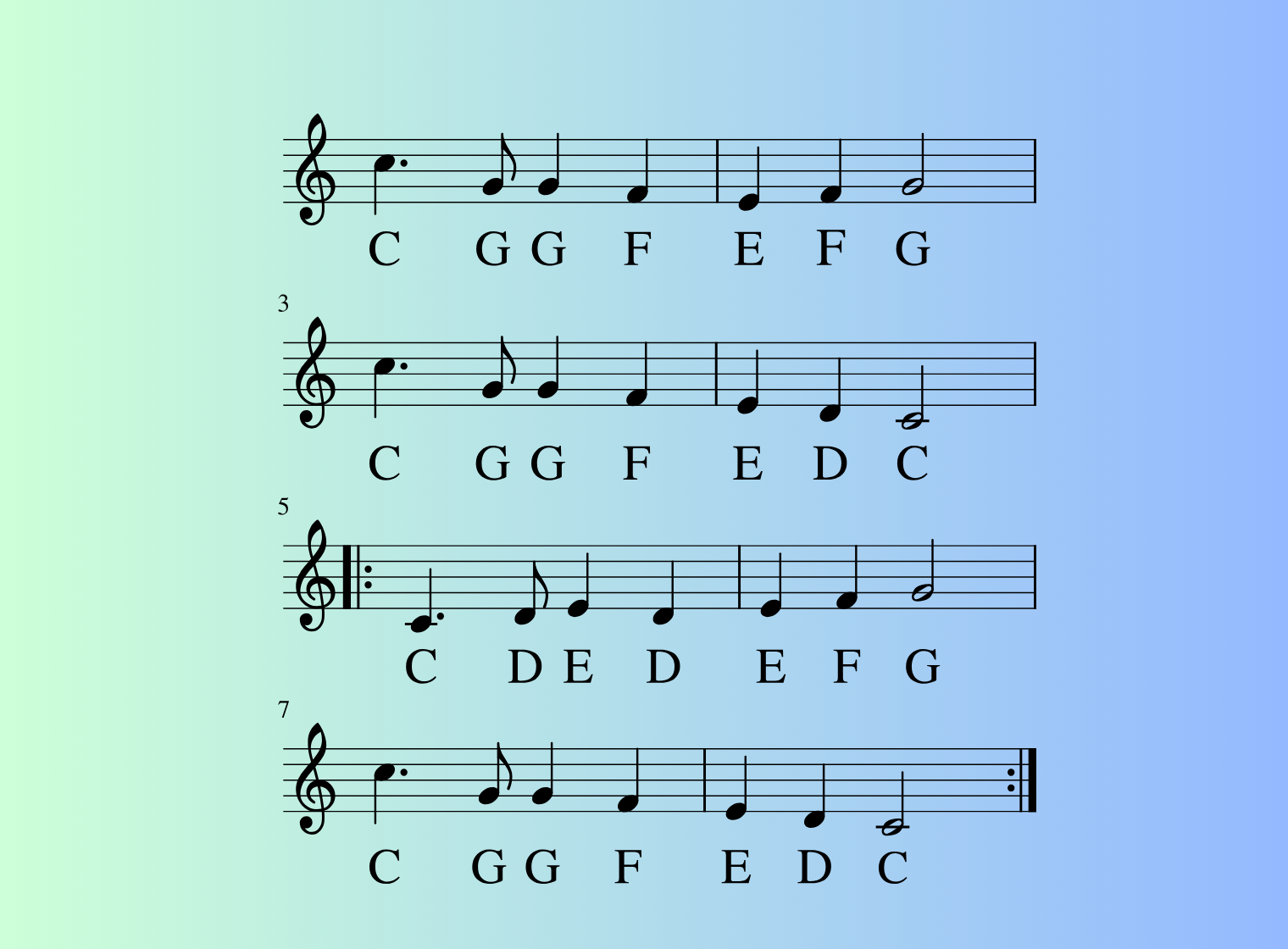 Nazwy nut podpisane literowo, co ułatwia grę i uczy nazw dźwięków.