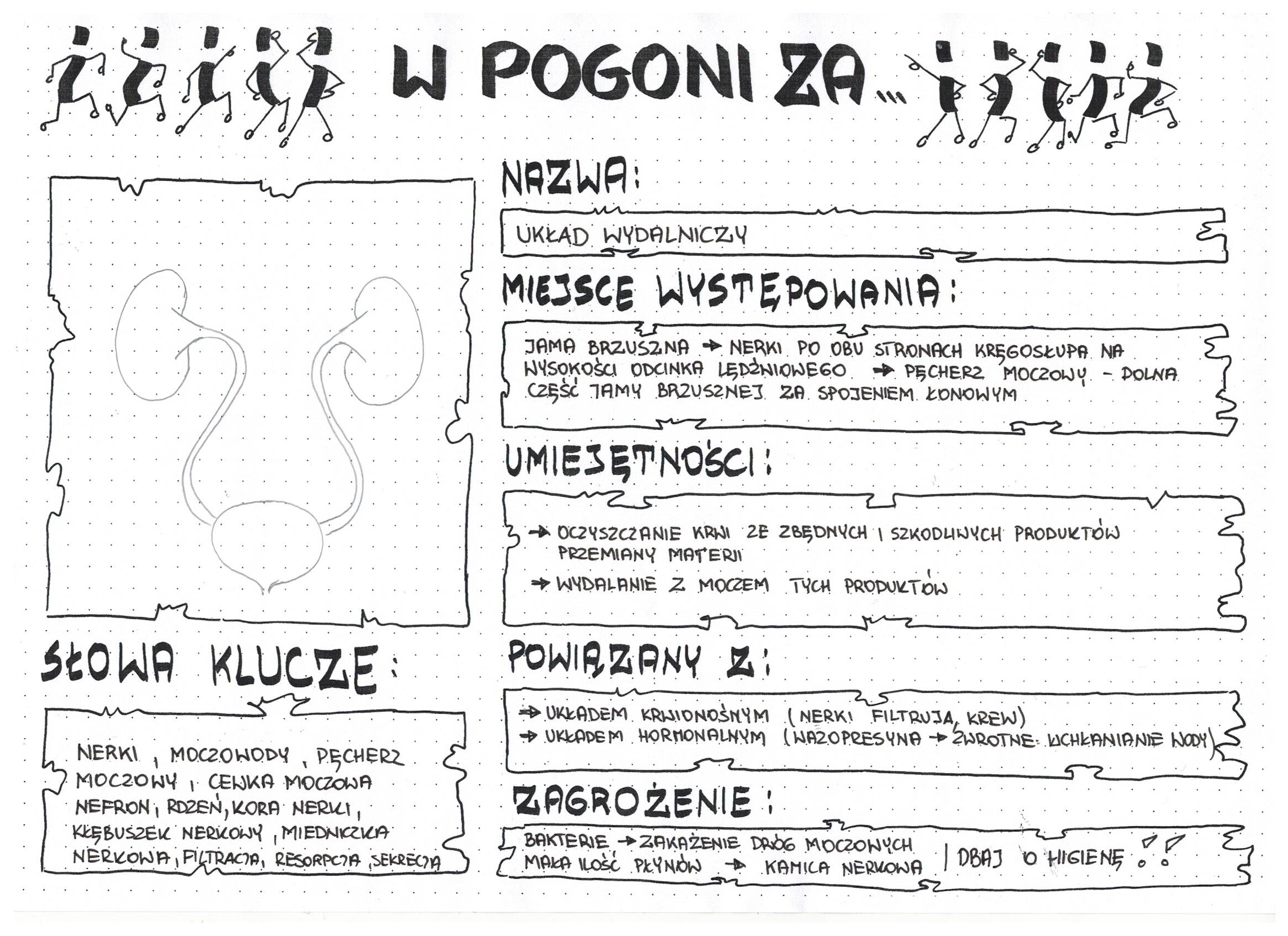W pogoni za ..... Do pobrania jest pusta karta Kp do uzupełnienia. Sketchnotka, która może być podsumowaniem zdobytej wiedzy, sprawdzeniem umiejętności w połączeniu z wychwytywaniem kluczowych zagadnień, słów związanych z tematem. W pogoni za... można zastosować do wielu tematów - w załączeniu pogoń za układem wydalniczych. Słowa klucze to pierwsze skojarzenia do wybranego tematu, Nazwa - tu wpisujemy kogo poszukujemy. Miejsce występowania - gdzie, w tym przypadku dany organ, układ się znajduje, Umiejętności - za co odpowiada w naszym organizmie. Powiązany z - z jakim innym układem, organem jest powiązany. Zagrożenia - co może mu zagrażać np jakie choroby.