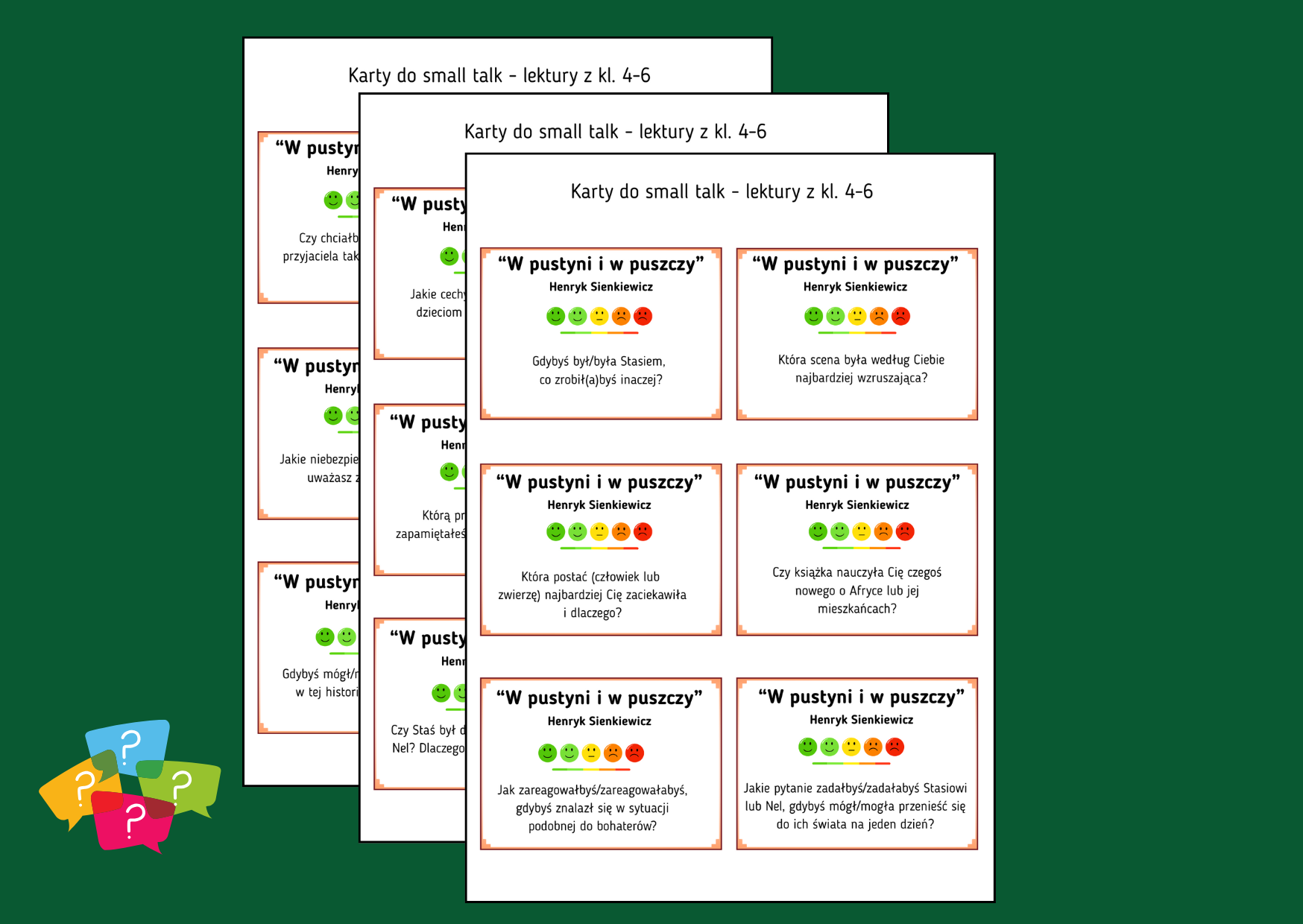 18 pytań typu „Karty small talk” do „W pustyni i w puszczy”. Takie pytania mają charakter swobodny, zachęcają do refleksji, rozmowy i dzielenia się opinią, a nie tylko sprawdzają wiedzę. Mogą być wykorzystywane na lekcjach jako forma integracji z lekturą lub podczas luźniejszych rozmów literackich. Dzięki nim można ćwiczyć wypowiedź argumentacyjną. Zasady: uczeń losuje kartę i odpowiada na pytanie (lub wszyscy uczniowie odpowiadają na to samo pytanie).