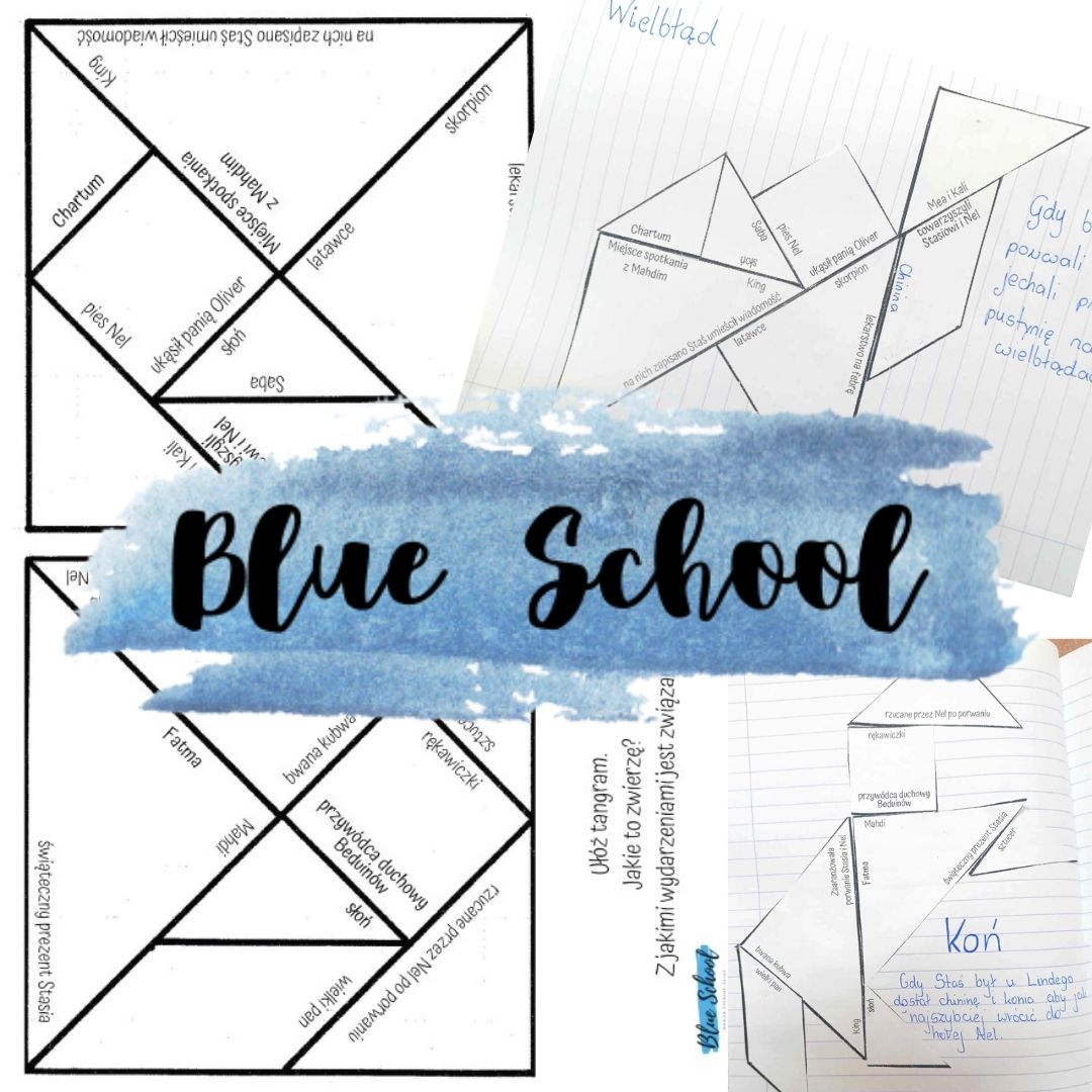 Materiał na jednej stronie A4 zawiera 2 tangramy związane z lekturą „W pustyni i w puszczy”. Uczeń po złożeniu tangramu zastanawia się, co przedstawia układanka (na jednym tangramie jest wielbłąd, na drugim koń). Następnie zapisuje, jakie to zwierzę i z jakimi wydarzeniami z lektury jest związane.