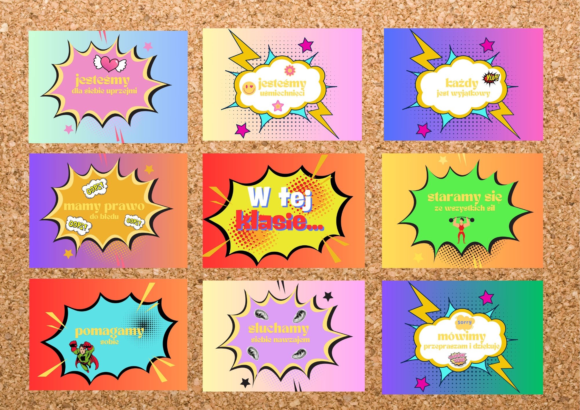 10 plansz na gazetkę klasową, stanowiących kodeks klasowy. W stylu POP ART.