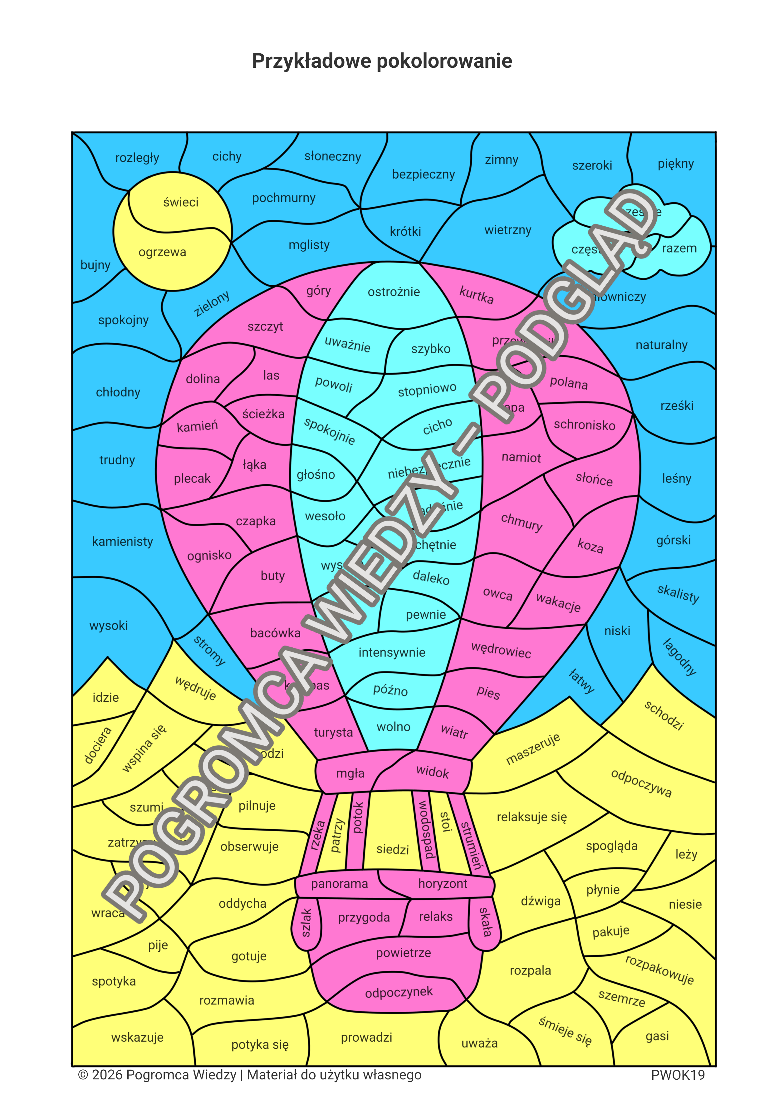 Karta pracy „Wakacje w górach” to ćwiczenie utrwalające części mowy w atrakcyjnej, wakacyjnej formie. Uczniowie wyszukują rzeczowniki, czasowniki, przymiotniki i przysłówki, a następnie przyporządkowują je do odpowiednich grup, rozwijając umiejętność ich rozpoznawania w kontekście. Materiał sprawdzi się jako powtórzenie oraz utrwalenie wiadomości w klasach 4–6, zarówno na lekcji, jak i podczas pracy samodzielnej. Karta należy do wakacyjnej serii kart pracy dotyczących części mowy