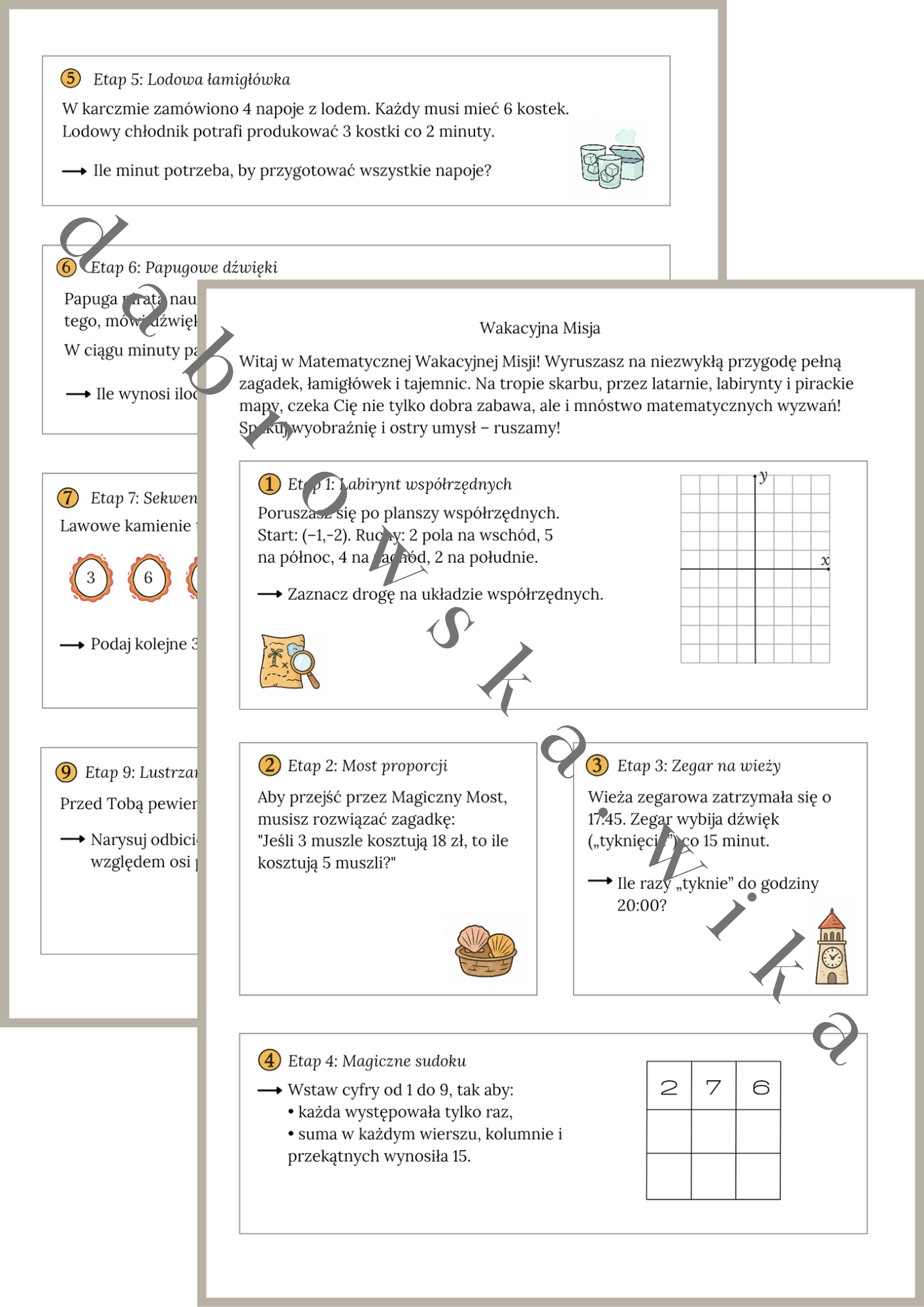 Materiał zawiera kartę pracy pt. „Wakacyjna Misja Matematyczna”, która w formie przygodowej gry zachęca uczniów do rozwiązywania zadań i zagadek matematycznych.