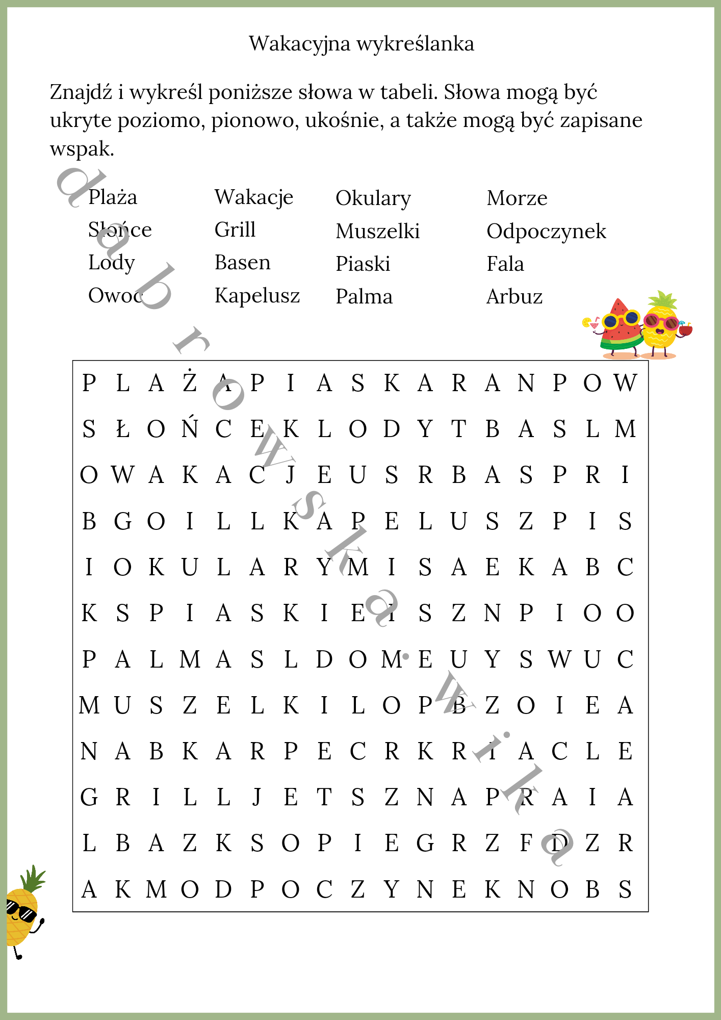 Zadaniem jest odnalezienie w wykreślance szesnastu słów związanych z tematyką wakacji.