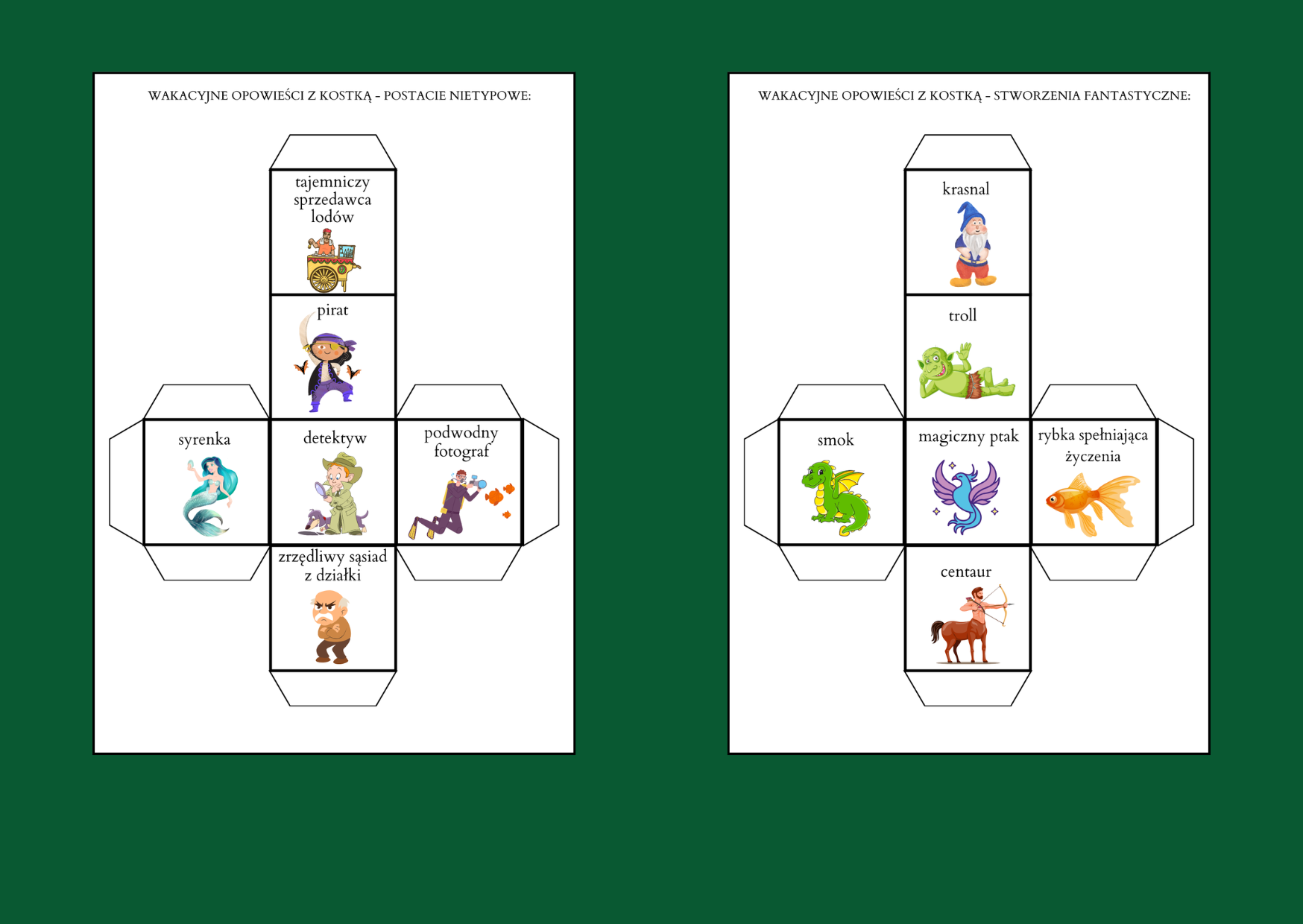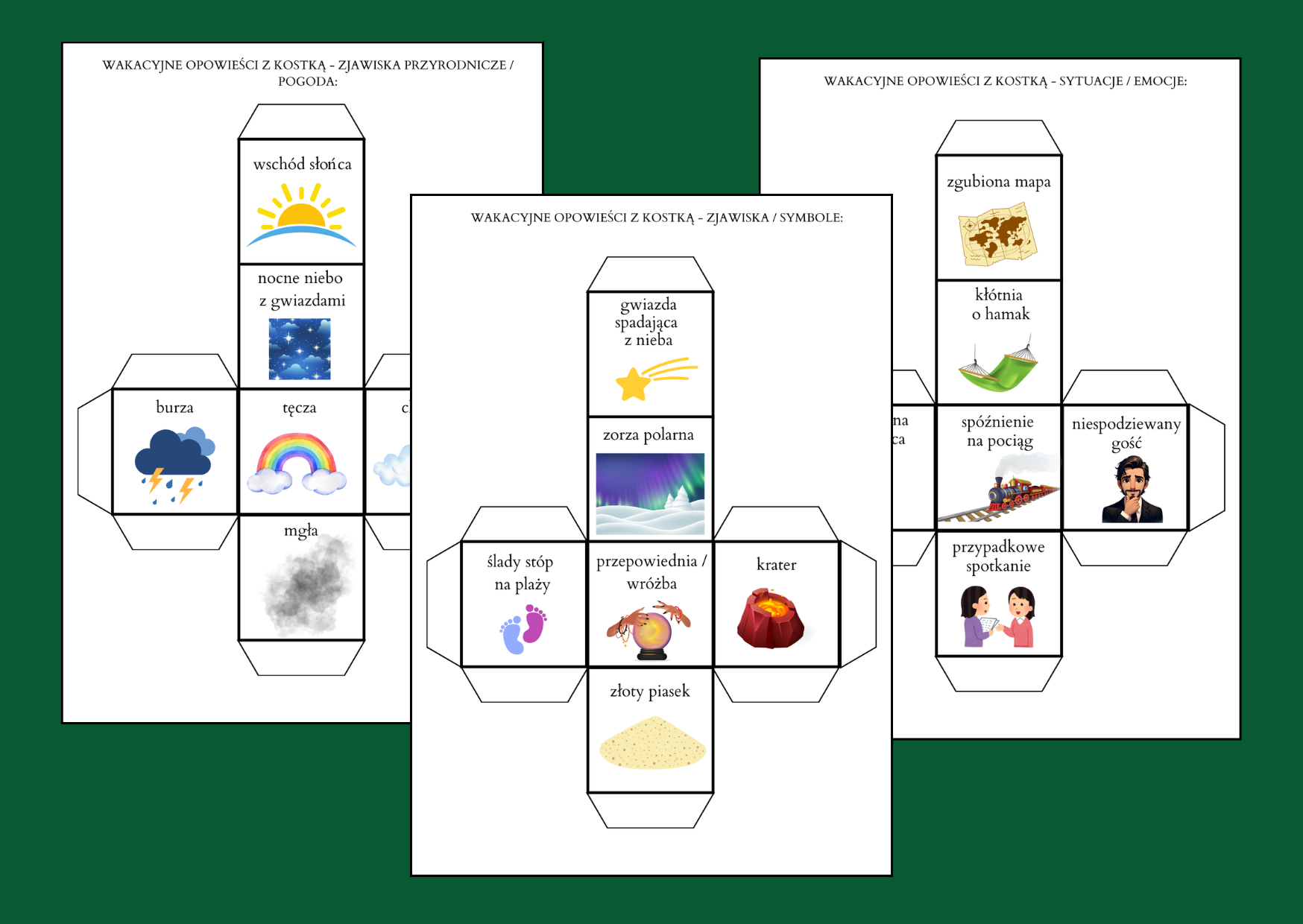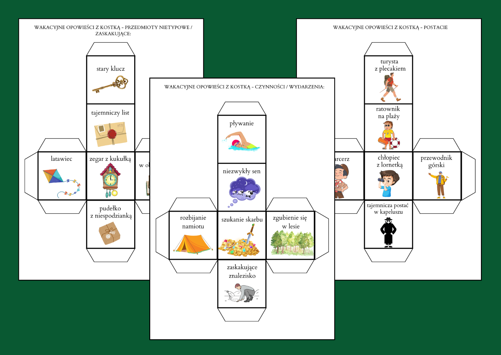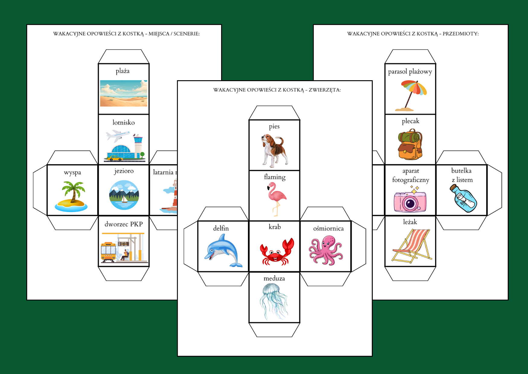 Proponuję „Wakacyjne Opowieści z Kostką” – doskonałą aktywność rozwijająca wyobraźnię, kreatywność i umiejętność wypowiedzi pisemnej i ustnej. Dzieci losują (lub rzucają) kostką z ilustracjami przedstawiającymi wakacyjne motywy (np. słońce, namiot, burza, pies, plaża, latarnia morska). Następnie, na podstawie wylosowanych elementów, układają np. wakacyjną historię - ustnie lub pisemnie. Opowieść może być śmieszna, tajemnicza, przygodowa lub fantastyczna. Kostki można wykorzystać w ciągu całego roku szkolnego, przed lub po wakacjach. Warianty: