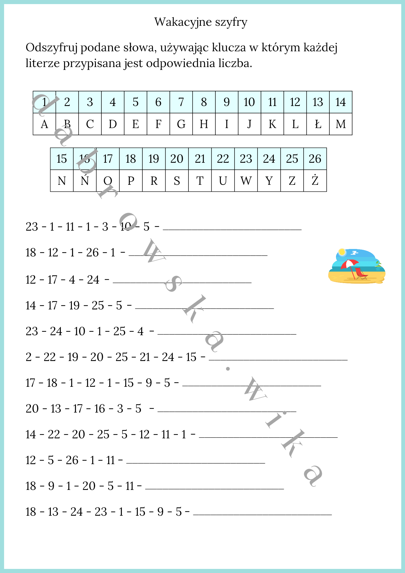 Zadaniem jest rozszyfrowanie słów dotyczących tematyki wakacji przy użyciu klucza, w którym każdej liczbie jest przypisana litera.
