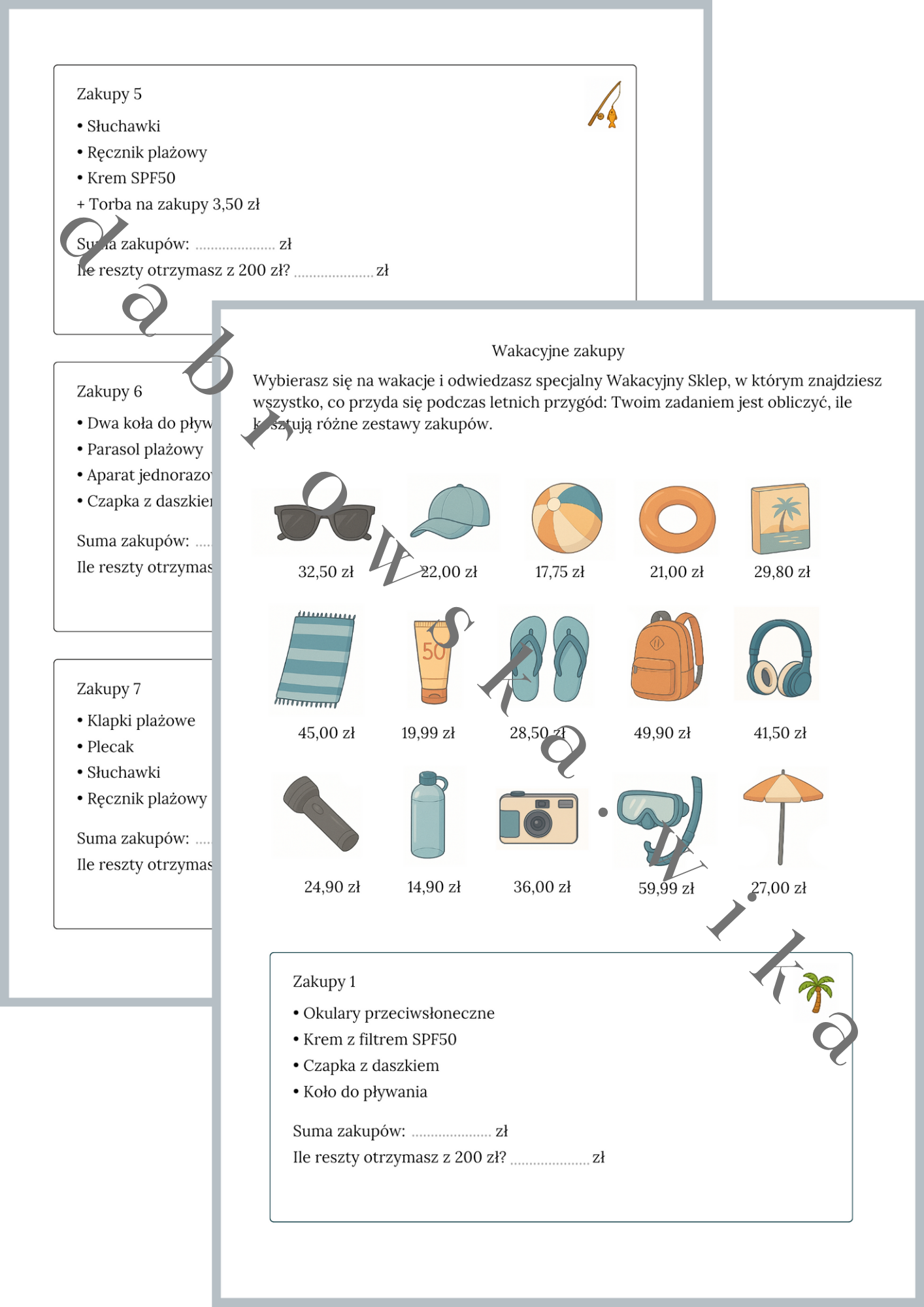 Zadania są osadzone w kontekście wakacyjnych zakupów – uczniowie wybierają produkty ze sklepu plażowego, sumują ich ceny i sprawdzają, ile pieniędzy zostanie z 200 zł.