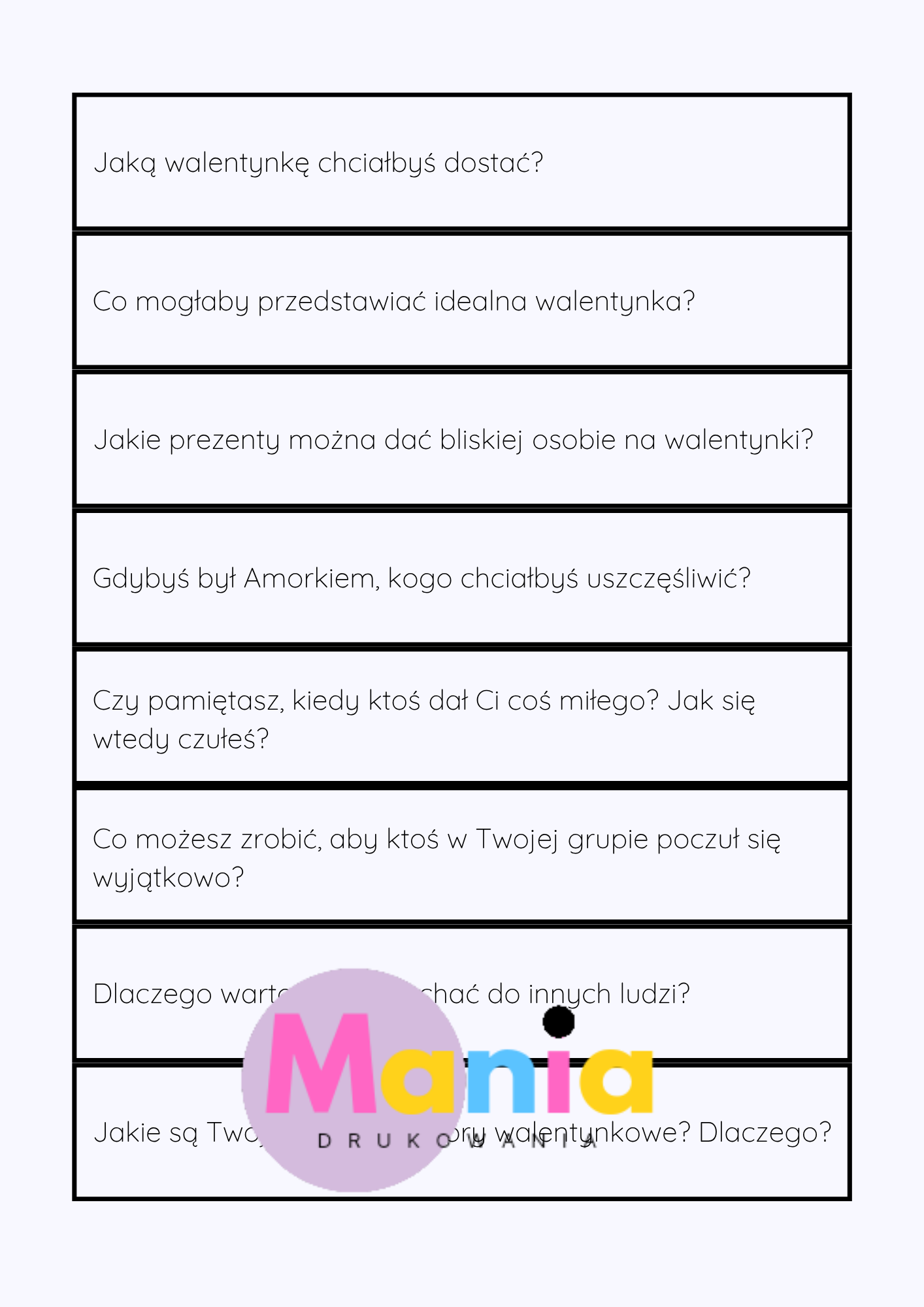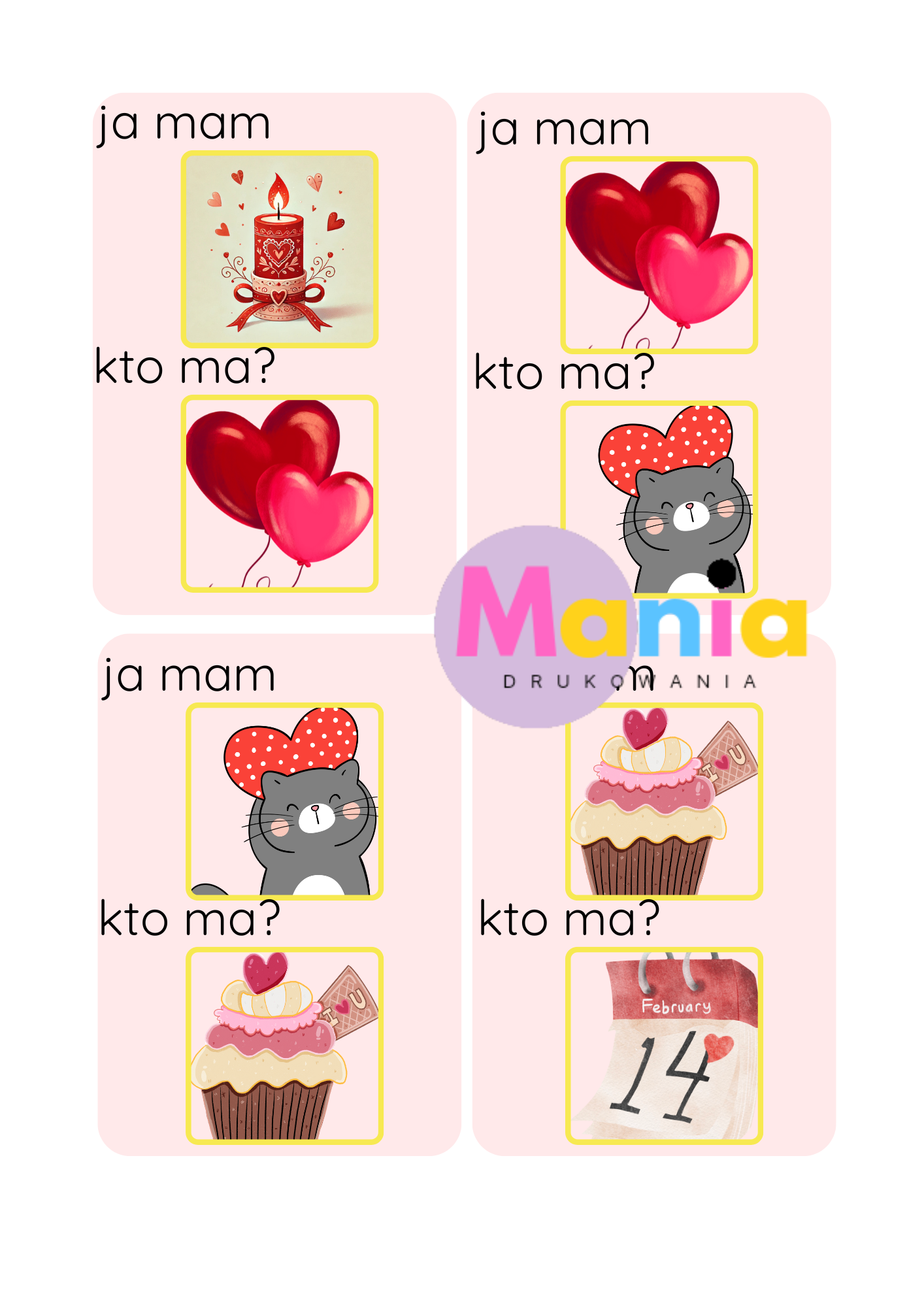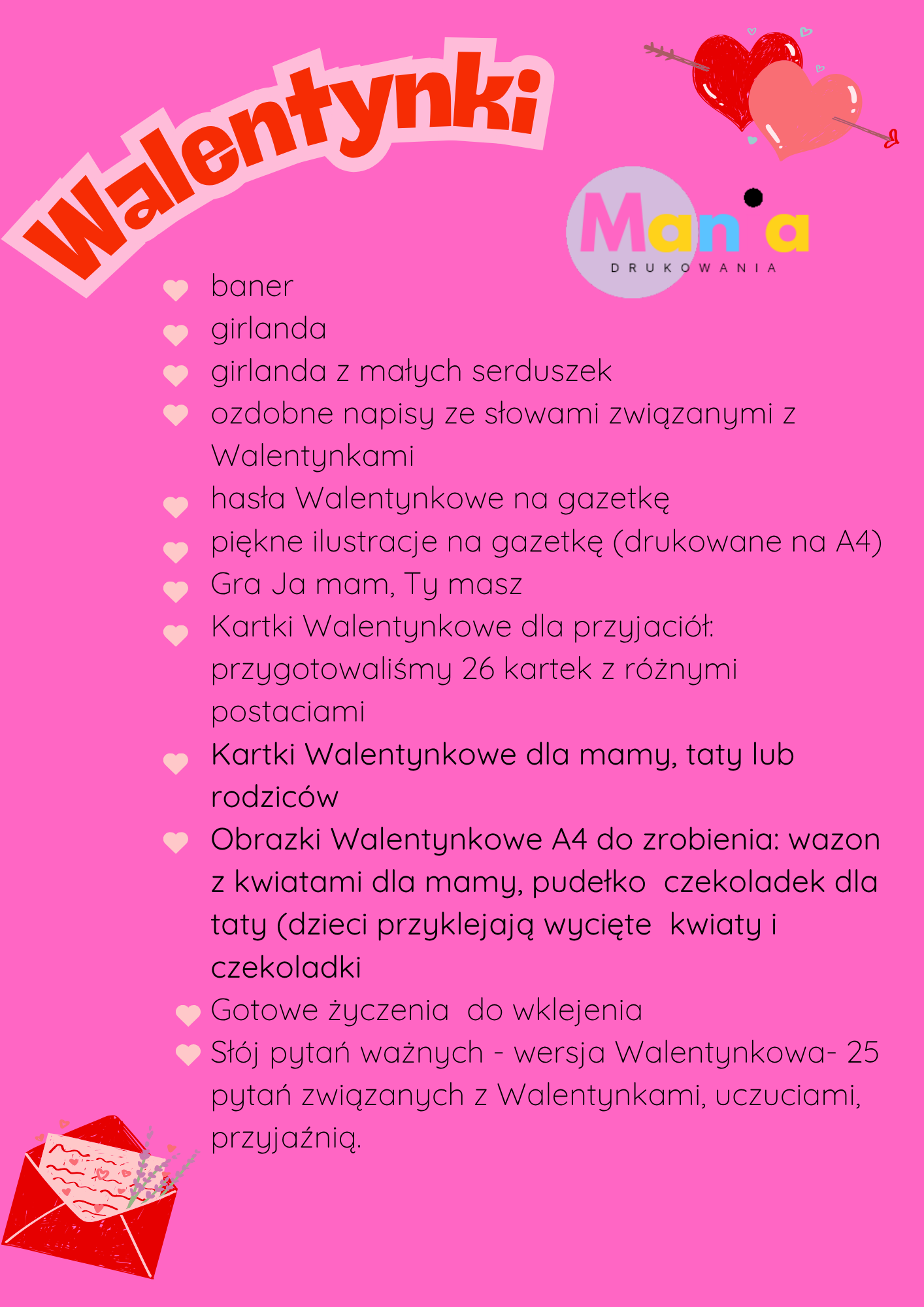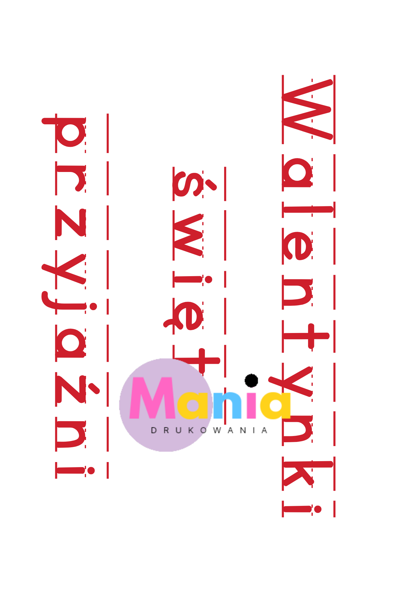 Mania Drukowania – kreatywne materiały edukacyjne do drukuW sklepie Mania Drukowania oferujemy starannie opracowane materiały PDF do samodzielnego wydruku, stworzone z myślą o nauczycielach, terapeutach, rodzicach oraz wszystkich, którzy pracują z dziećmi w wieku przedszkolnym i wczesnoszkolnym.Nasza oferta obejmuje m.in.: karty pracy i zadania rozwijające umiejętności dzieci, gry edukacyjne, zabawy ruchowe i pakiety tematyczne, dekoracje na święta, uroczystości przedszkolne i pory roku, zaproszenia i ozdoby na urodziny oraz inne okazje, kalendarze, girlandy, plakaty oraz dodatki do organizacji zajęć. Dlaczego warto wybrać Mania Drukowania?✔️ Materiały tworzone z dbałością o estetykę i wartość edukacyjną.✔️ Pomoc w organizacji zajęć, świąt i codziennej pracy z dziećmi.✔️ Jasne instrukcje, kolorowe grafiki i przyjazny styl pracy z dziećmi. Naszą misją jest wspieranie edukacji przez kreatywne i atrakcyjne rozwiązania gotowe do użycia – zawsze w duchu nauki przez zabawę.