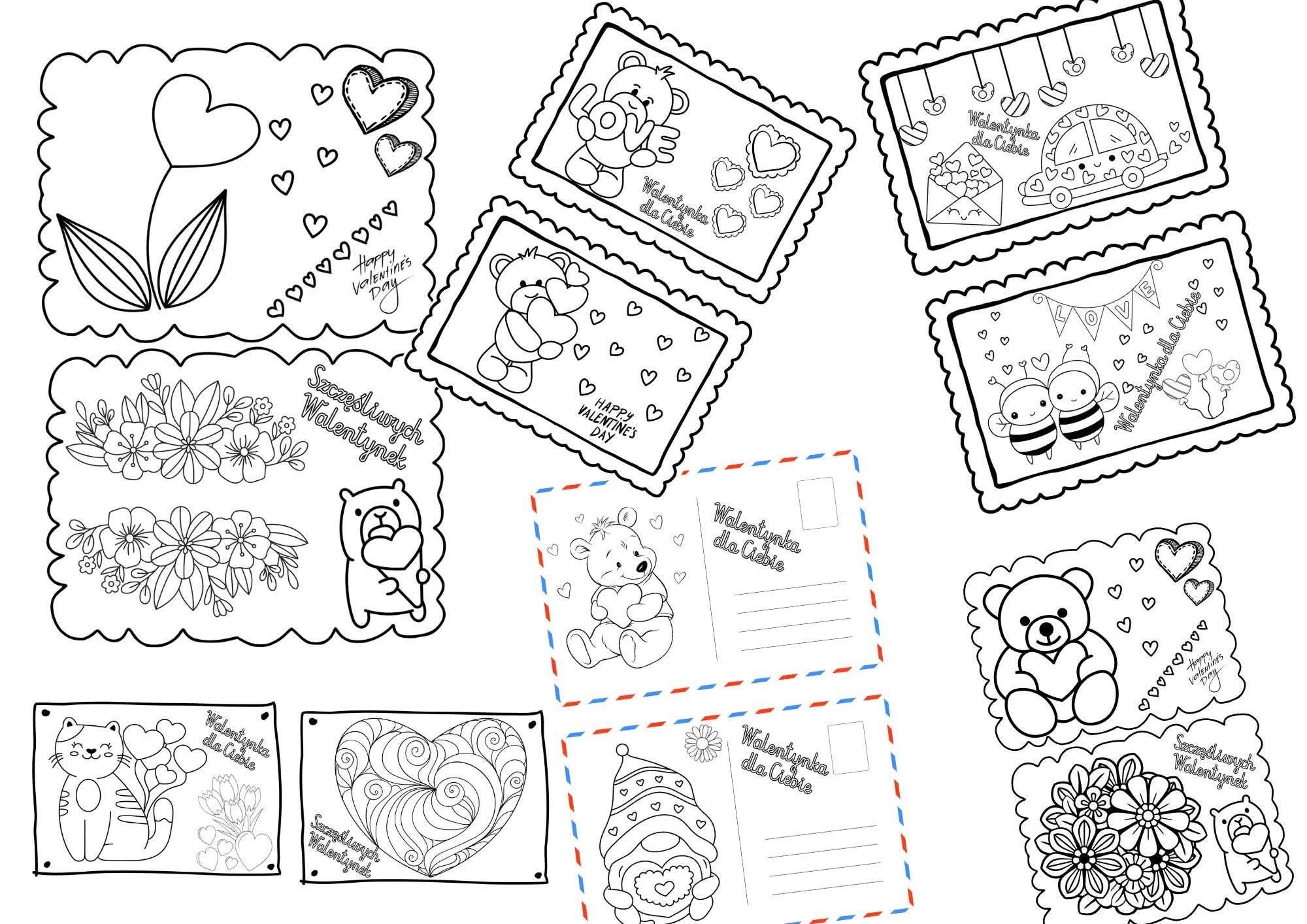 Walentynki do samodzielnego pokolorowania i zaadresowania. W zestawie 22 różnych propozycji.