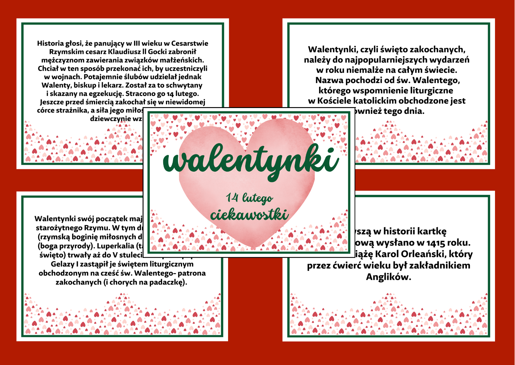 Gazetka pt. „Walentynki. Ciekawostki” – składa się z 15 stron A4 pdf do wydruku. Oferuję także inne wersje kolorystyczne tej gazetki.