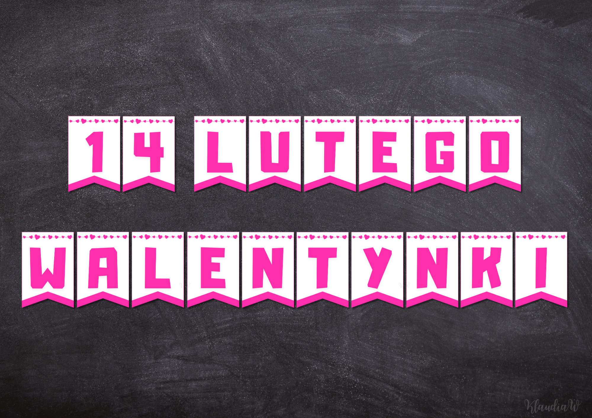 W pliku PDF girlanda z napisem „14 LUTEGO WALENTYNKI”. Każda literka na osobnej stronie A4. Świetnie sprawdzi się jako dekoracja sali.