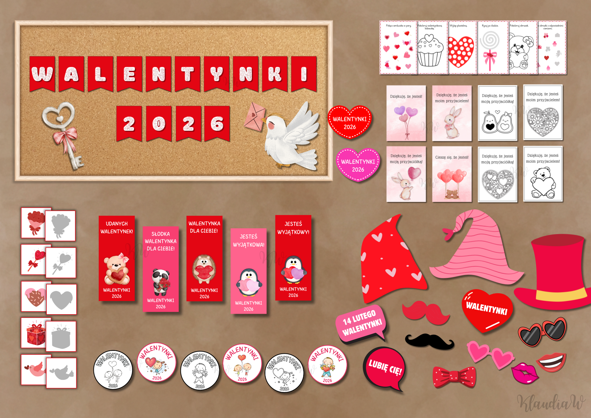 Szukasz gotowych materiałów na Walentynki, które zachwycą dzieci i zaoszczędzą Twój czas? Ten walentynkowy zestaw w formacie PDF to idealne rozwiązanie! W zestawie znajdziesz: - napis dekoracyjny „WALENTYNKI 2026”, - obrazki do udekorowania sali: gołąbek (do sklejenia z 6 kartek A4) oraz klucz (do sklejenia z 4 kartek A4), - walentynki do pokolorowania z napisami: „Lubię Cię”, „Dziękuję, że jesteś moim przyjacielem!”, „Dziękuję, że jesteś moją przyjaciółką!”, „JESTEŚ WYJĄTKOWĄ OSOBĄ!” - po 4 szablony, - kolorowe walentynki z napisami: „Dziękuję, że jesteś moim przyjacielem!”, „Dziękuję, że jesteś moją przyjaciółką!”, „Cieszę się, że jesteś!”, „Dziękuję, że jesteś!” - po 4 szablony, - atrybuty do fotobudki - 20 różnych, - karty pracy - 6 stron A4, - gra - „Dopasuj obrazek z cieniem” - aż 24 pary, - walentynkowe zakładki - aż 18 wzorów (6 zakładek na stronie A4), - odznaki do pokolorowania „WALENTYNKI 2026”- 3 szablony, - kolorowe odznaki „WALENTYNKI 2026” - 3 szablony, - serduszkowe odznaki „WALENTYNKI 2026” w kolorze czerwonym i różowym Pobierz zestaw i ciesz się wyjątkowymi Walentynkami w swojej grupie!