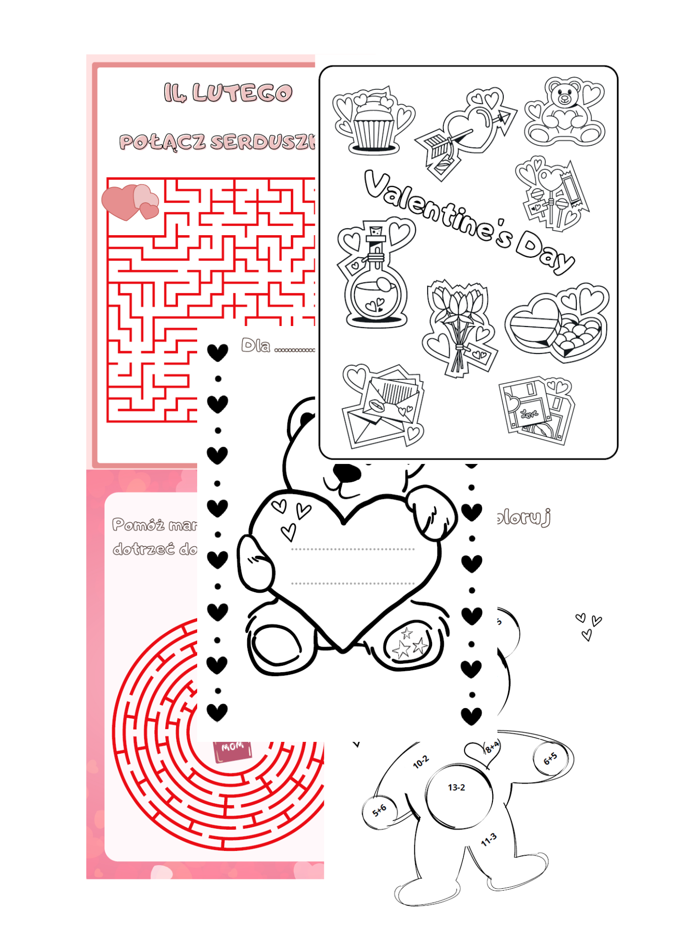 Karty pracy do druku. Walentynki. Pisanie po śladzie. Wzór walentynki. Liczenie do 20. Kolorowanka. Labirynty.