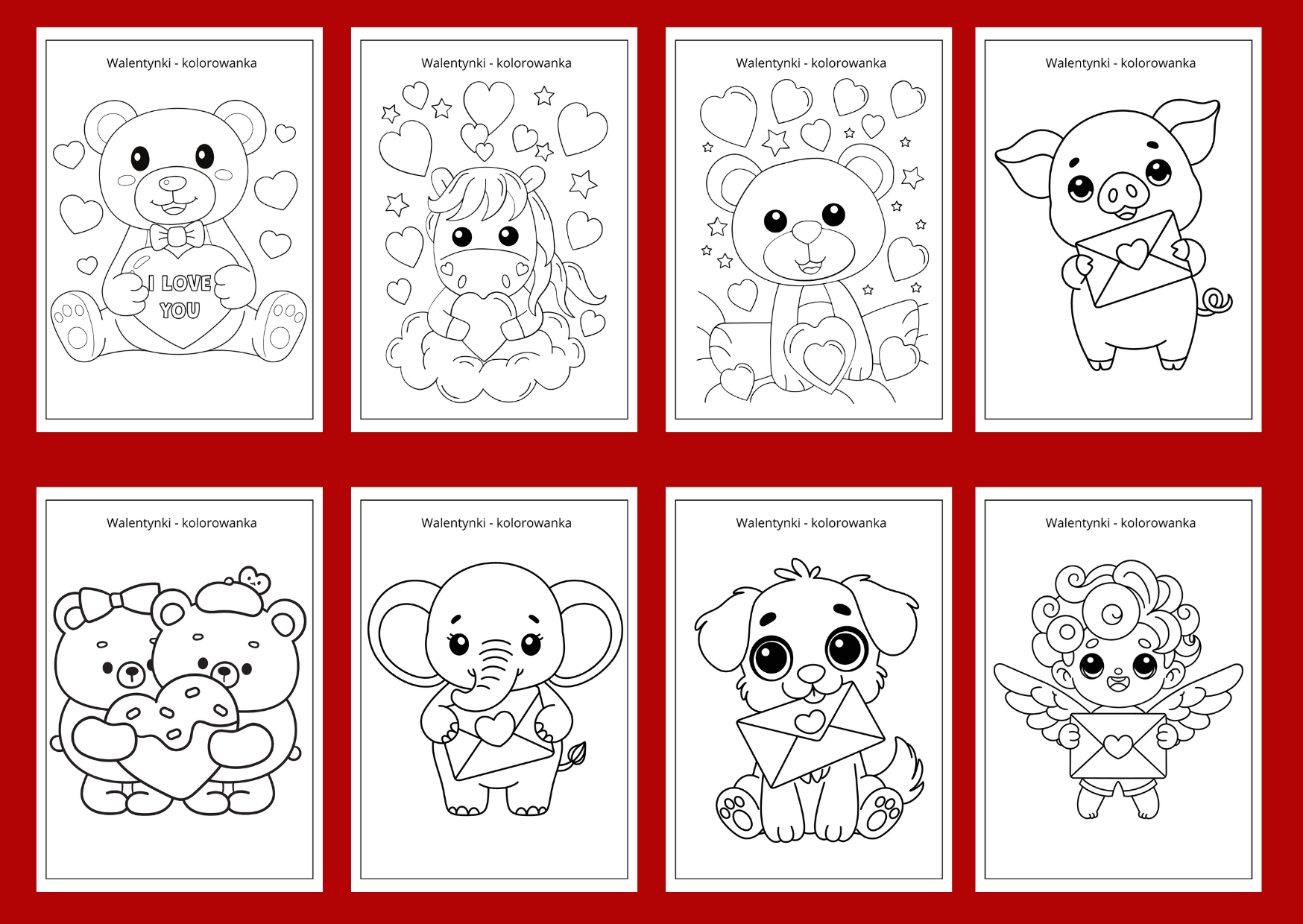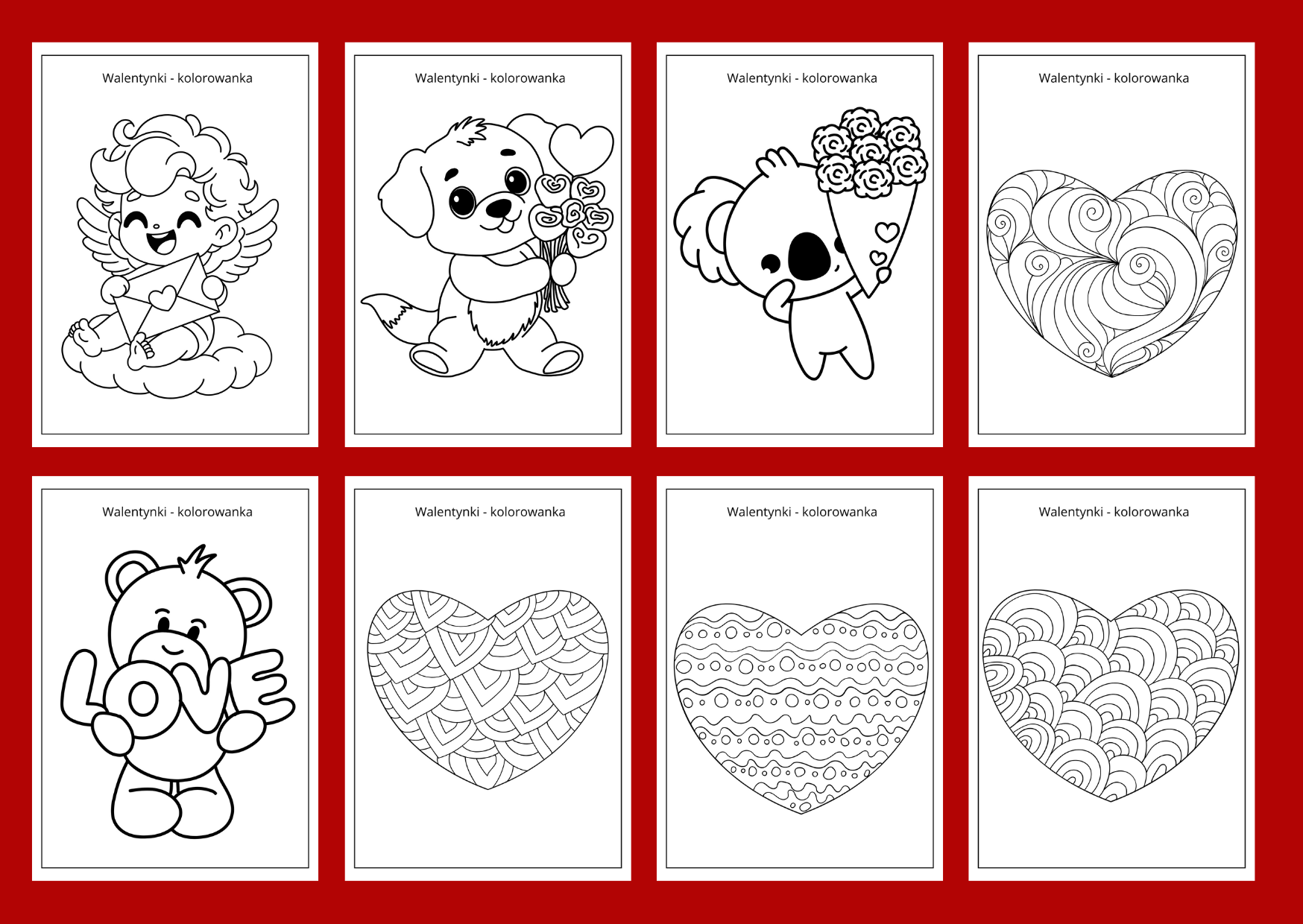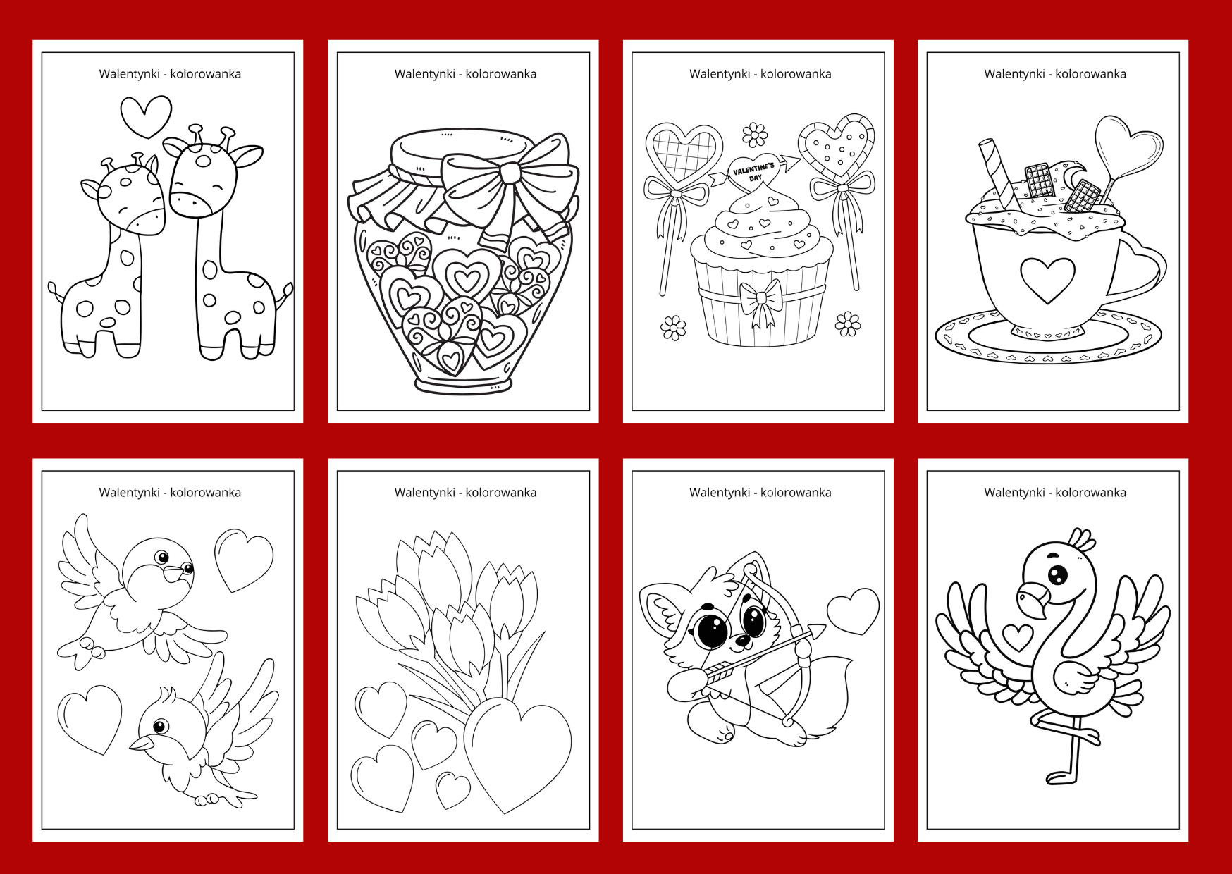 Materiał zawiera 30 kolorowanek z ilustracjami dotyczącymi walentynek. Po pomalowaniu przez dzieci kolorowanek, można stworzyć gazetkę. Wszystkie karty mają format A4.