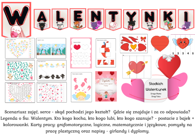 Scenariusz zajęć, serce - skąd pochodzi jego kształt? Gdzie się znajduje i za co odpowiada? Legenda o Św. Walentym. Kto kogo kocha, kto kogo lubi, kto kogo szanuje? - postacie z bajek + kolorowanki. Karty pracy: grafomotoryczne, logiczne, matematycznie i językowe, pomysły na pracę plastyczną oraz napisy - girlandy i dyplomy.