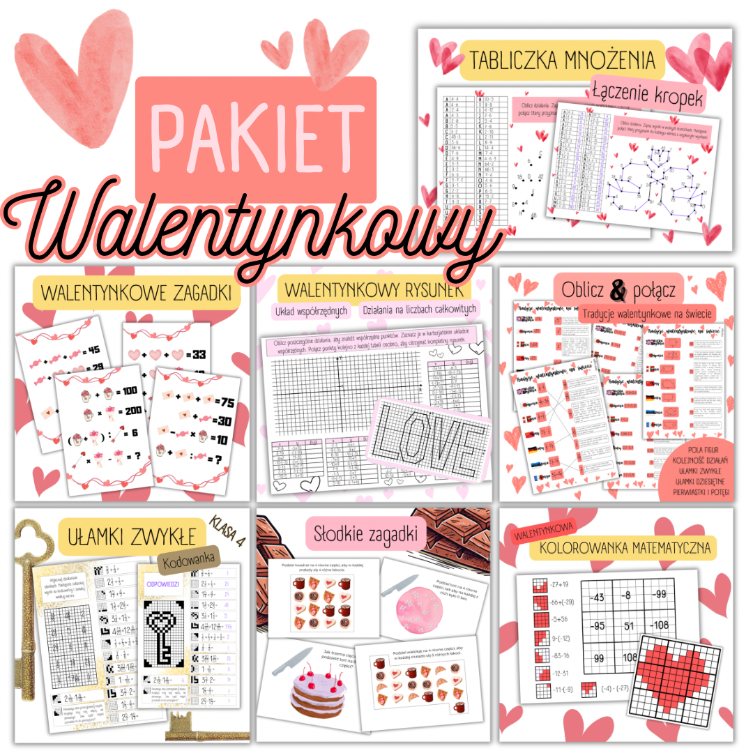 - tradycje walentynkowe na świecie- działania na ułamkach zwykłych i dziesiętnych, pola figur, kolejność działań, potęgi i pierwiastki,